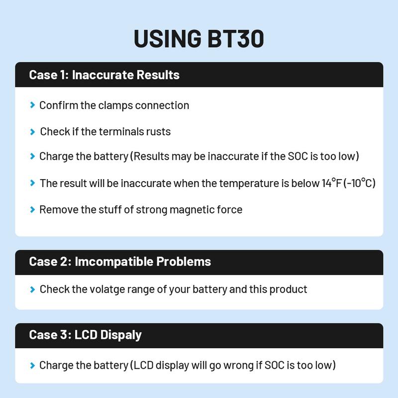 ·Get reliable and quick battery testing without breaking the bank. The BT30 offers unparalleled value, combining speed and accuracy with an affordable price, making it an essential tool accessible to all.