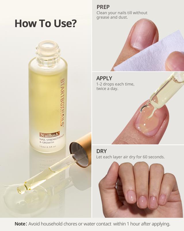 ·NEW NAIL STRENGTHENING SOLUTION: BTArtboxnails Naillush Nail Strengthener & Growth is specifically designed for people who have nail struggles. New solution to repair, strengthen, and stimulate nail growth.