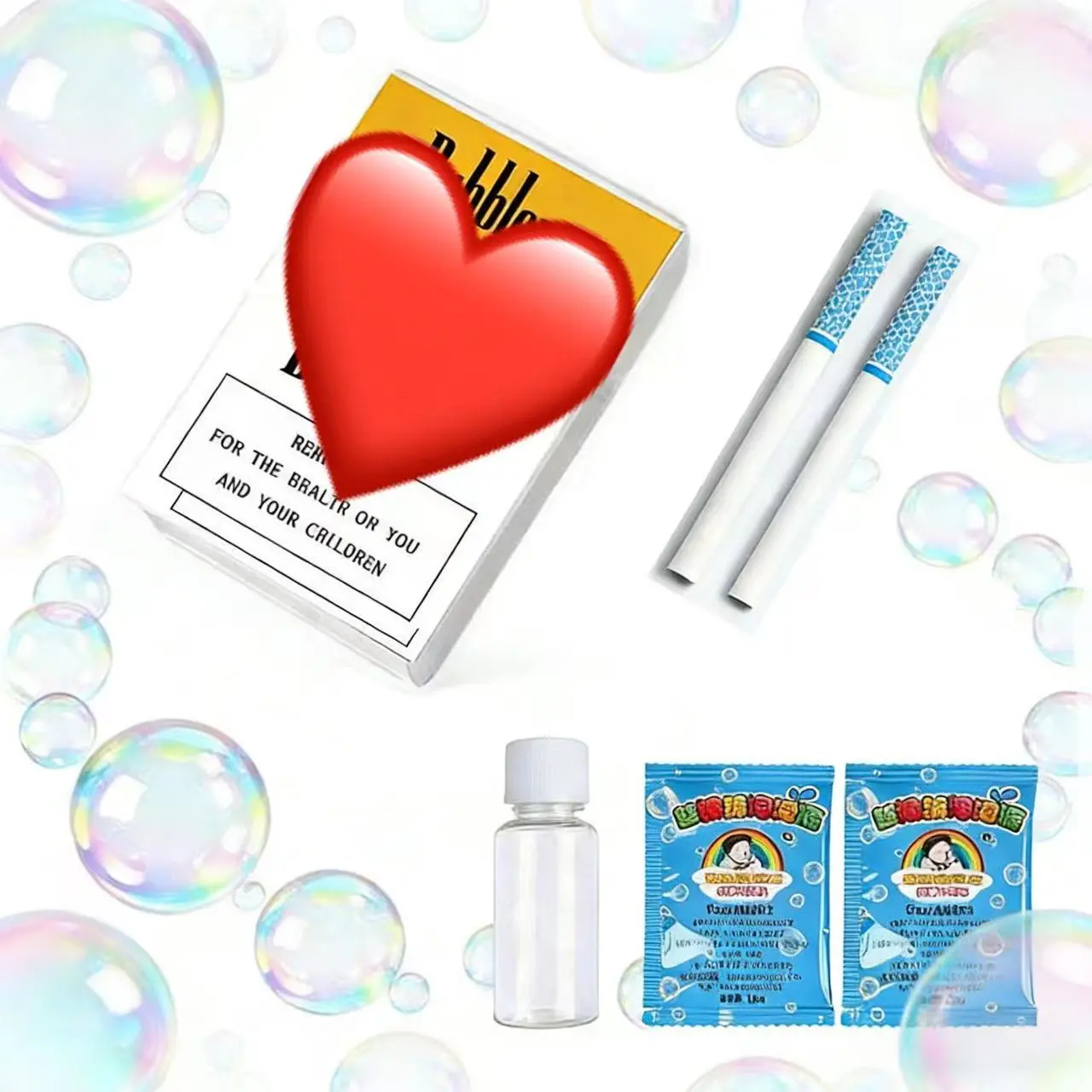 Doesnt come with bubbles, the box is hard to open and when you blow it just a bunch of small ones come out but it's still cool and i like it just remember to get bubble before you buy it