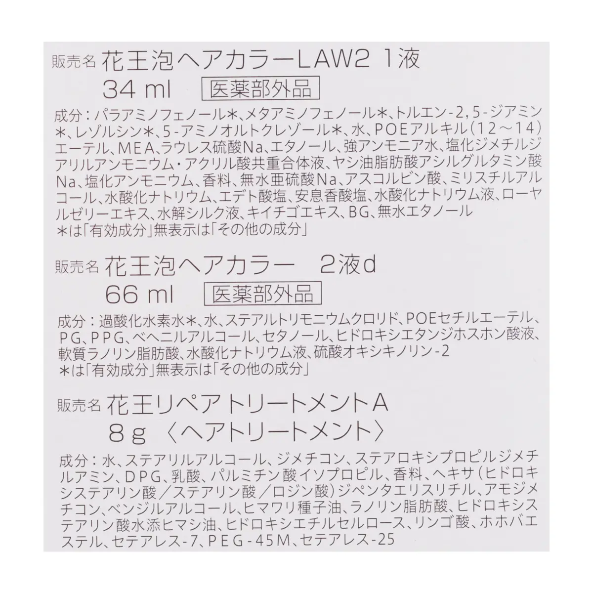 1. Kao liese Hair Color Agent No. 1 40ml 2. Kao liese Hair Color Agent No. 2 60ml 3. Pump head 4. Kao Prettia Treatment 4ml 5. Gloves 6. Instruction Manual