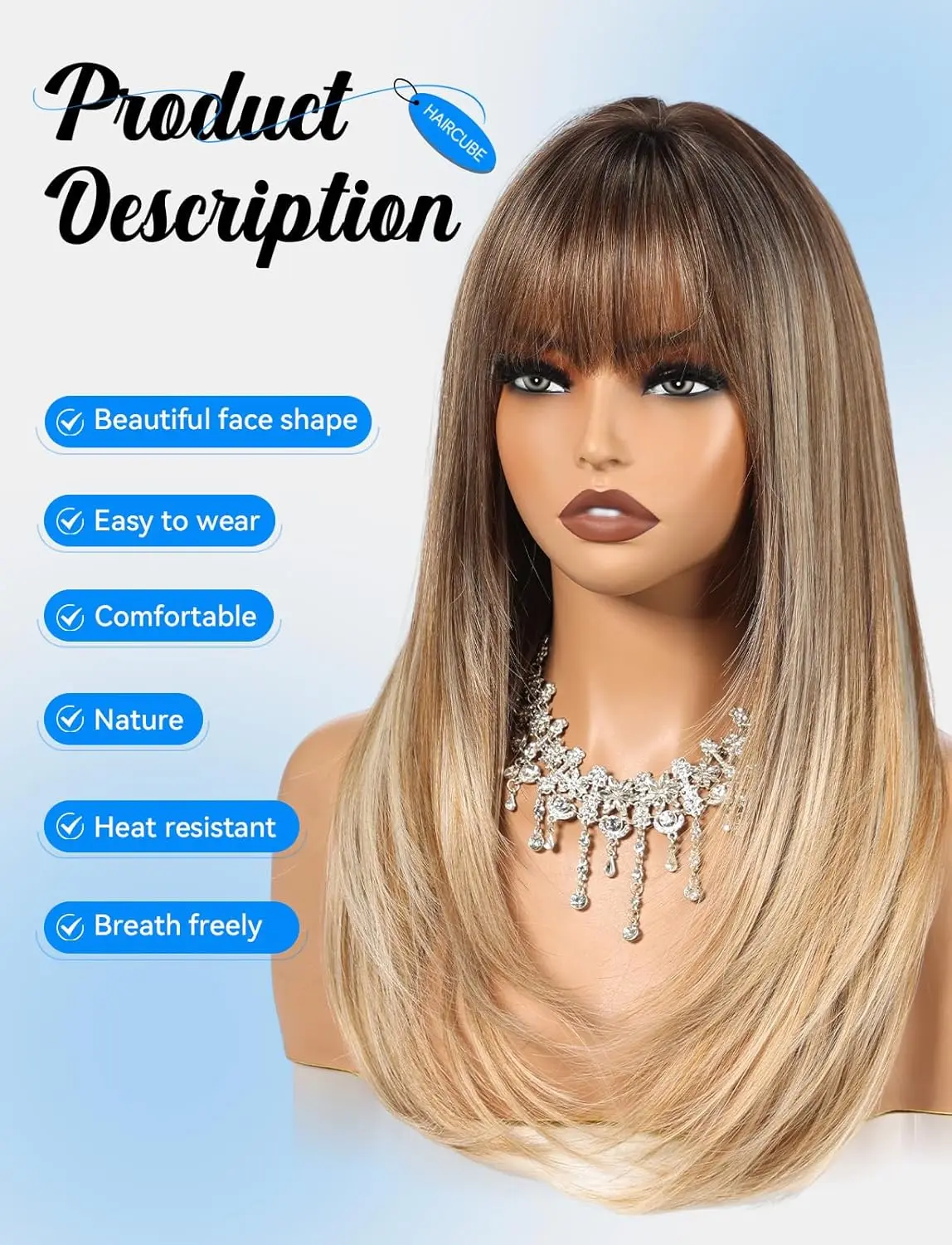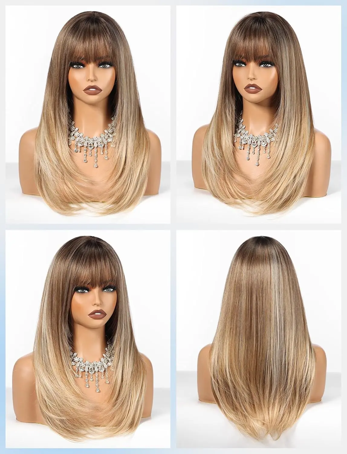 1. Glamorous Long Layers with Inward-Curved Ends This 20-inch long wig features soft, flowing layers crafted with advanced cutting techniques. The straight strands are slightly curved inward at the ends, naturally framing the face while adding volume and body for a full, lifelike appearance. Perfect for a natural, glamorous look that turns heads.