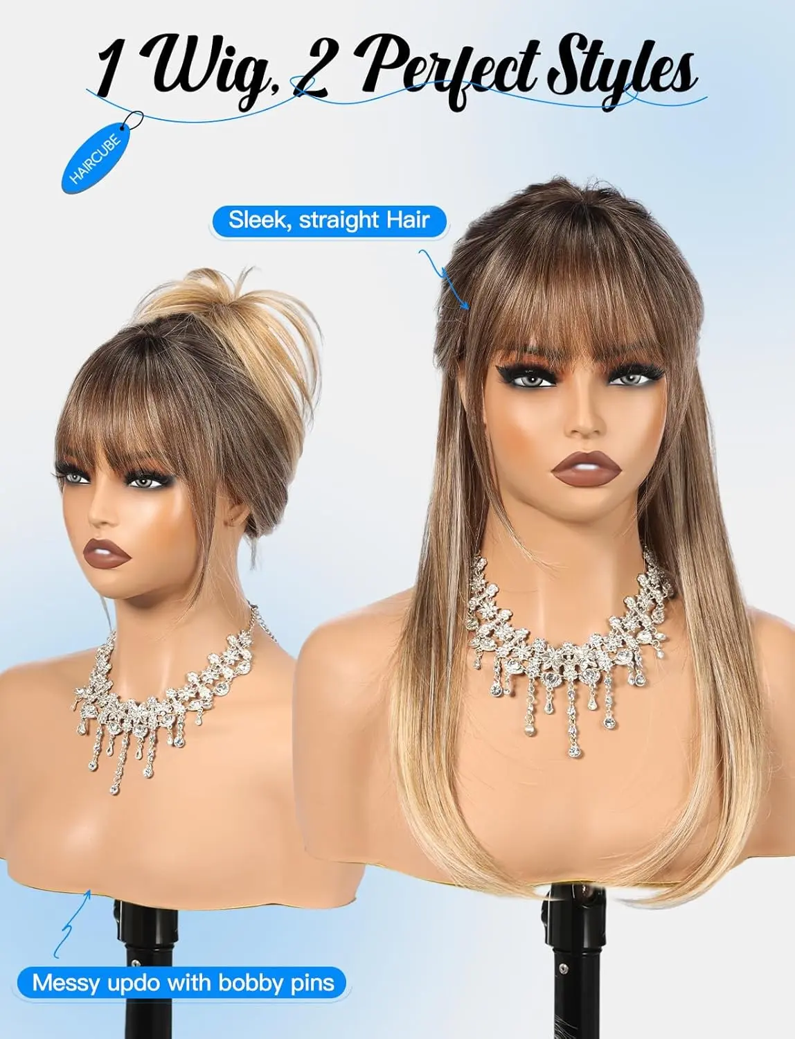 2. Flattering Curtain Bangs for All Faces The wig comes with versatile curtain bangs that can be trimmed or styled freely to suit your personal look. Flattering for all face shapes and age groups, these bangs give you endless styling possibilities.