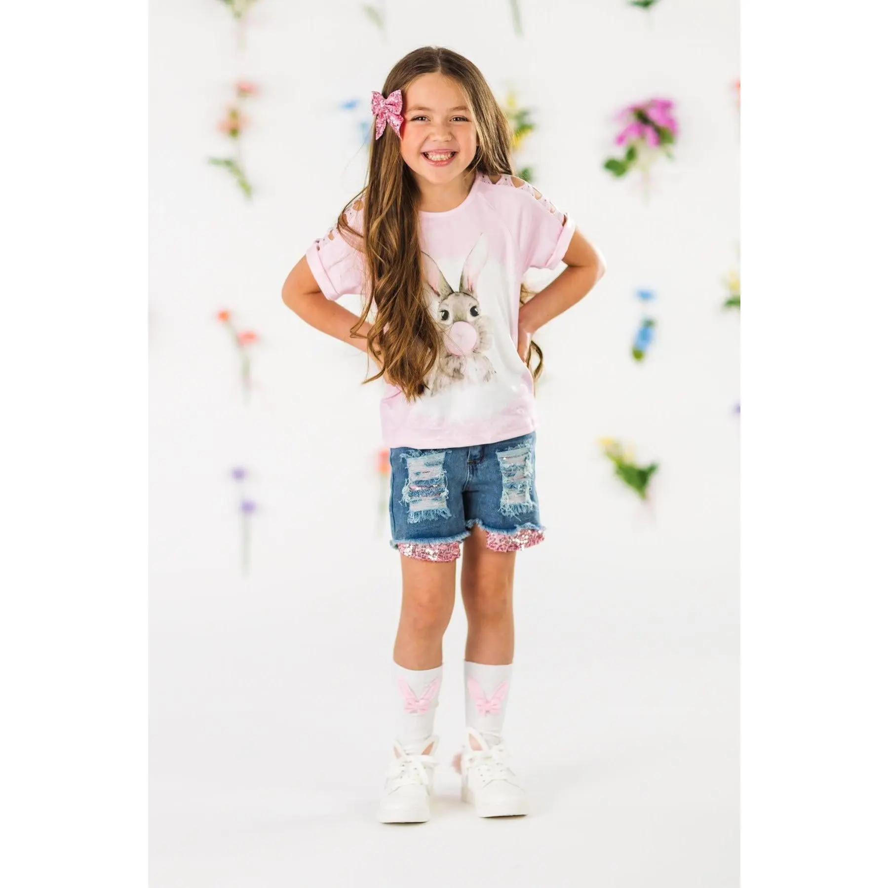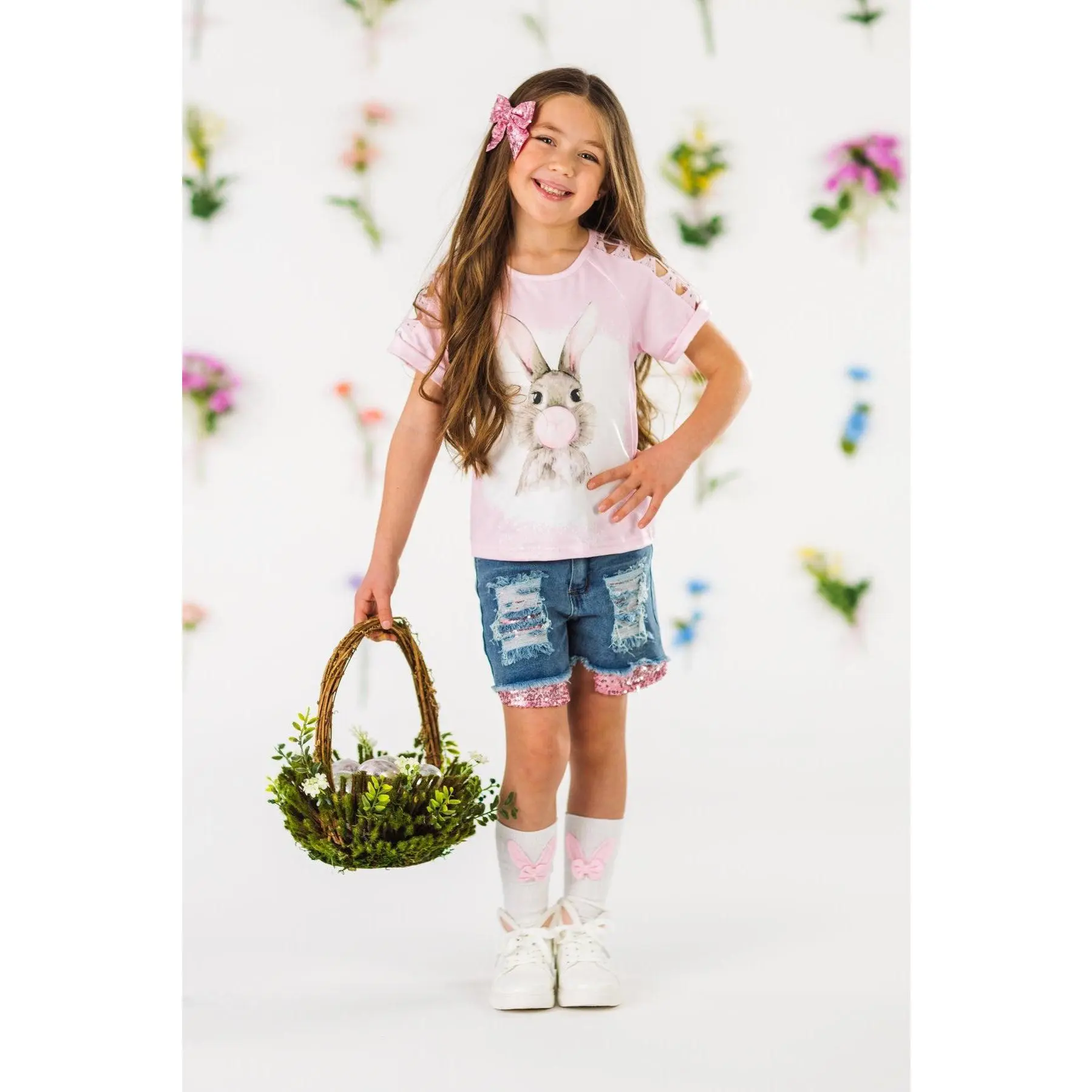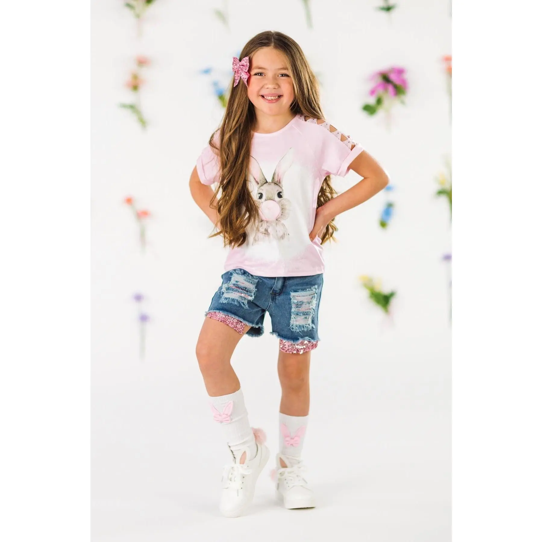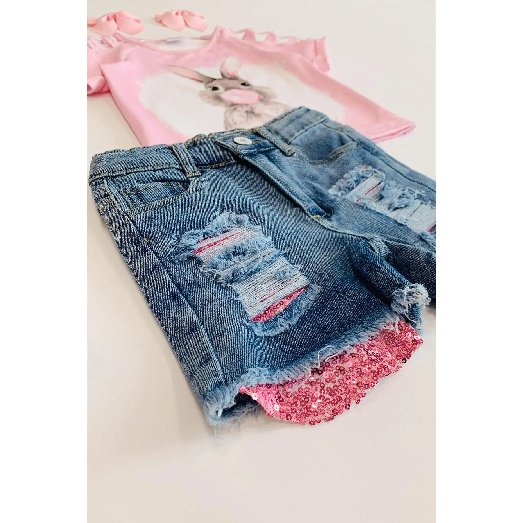 Your little bunny will look so adorable in our Bubblegum Bunny Distressed Denim Short Set. The pink top features crochet sleeves and a sweet bubblegum bunny design on the front and looks adorable paired with the denim shorts. The adjustable waistband provides a secure fit, while the distressed sequin design adds a fun touch. She can pair this set with sandals or our fun SIP bow for the perfect look!