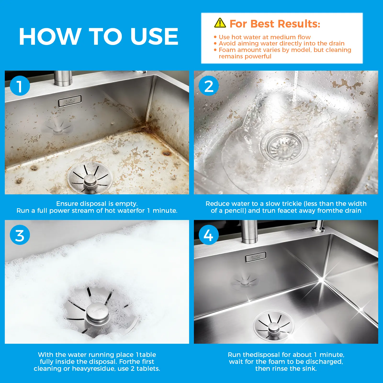 I followed the directions on the package and this product did absolutely nothing in my disposal.It did not foam it sounded like a bunch of rocks in my disposal. It was supposed to make foam in the disposal . This product is very dissatisfying. I will not recommend this product to anyone.