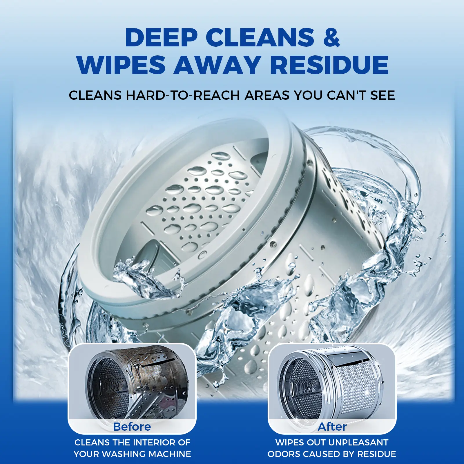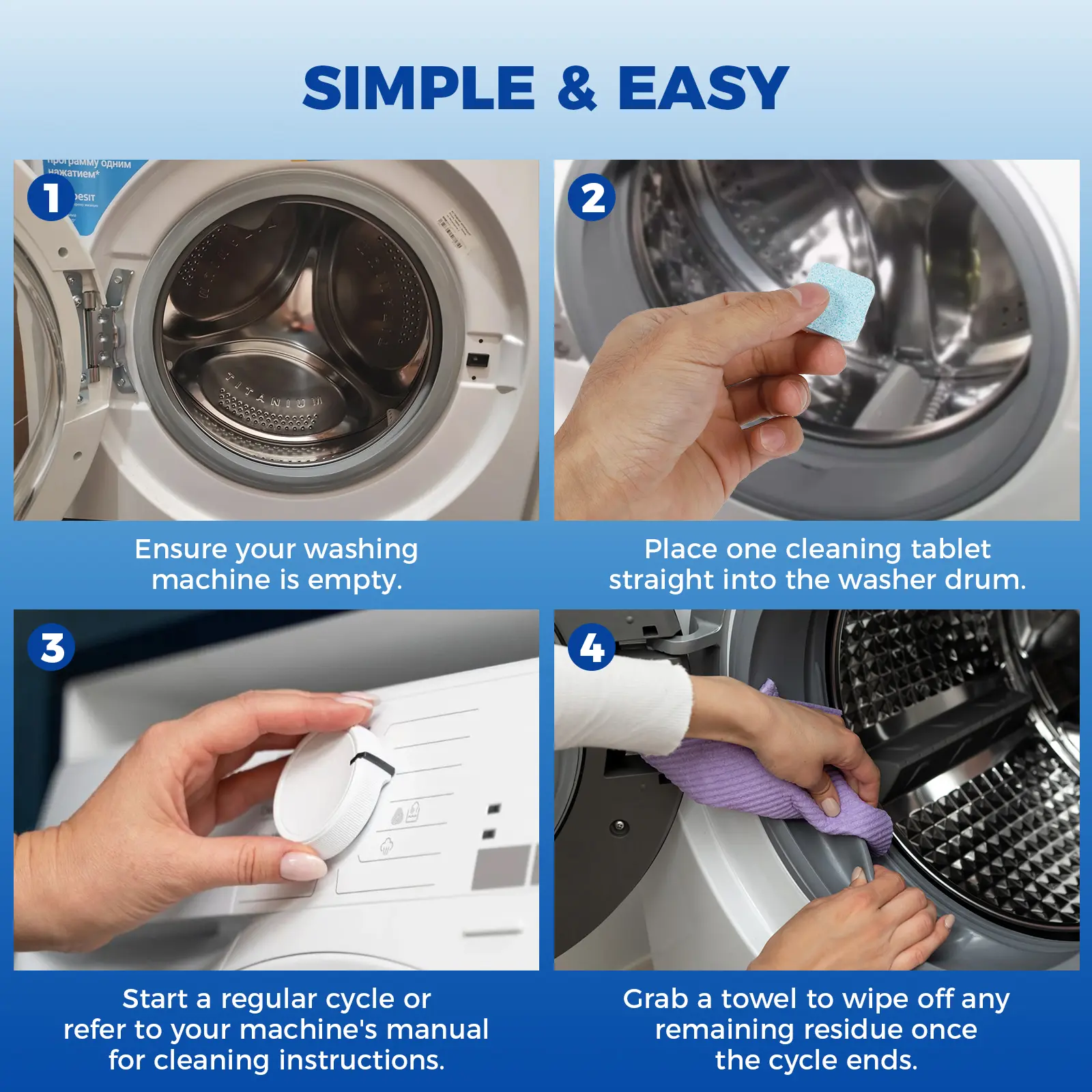 【Easy to use】Simply place a washer cleaner into the washing machine drum and run the normal wash cycle (Make sure the washing machine is empty). After washing, wipe off the residue with a towel.