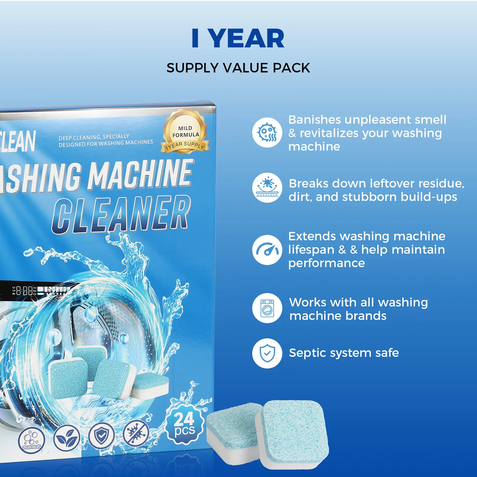 【Long-Lasting Use】Compact packaging. Ready to use anytime. Compared to tablets or liquid cleaners that use up quickly, BUBCLEAN 24 tablets washer cleaner contains a year's supply.