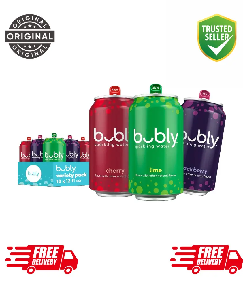 The Bubly Sparkling Water Lime Yours 3 Flavor Variety Pack includes a mix of lime, cherry, and blackberry flavors in a convenient can packaging. Each can contains 12 fl oz of sparkling water, with a total of 18 cans in the pack. This variety pack offers a refreshing and flavorful option for those looking for a tasty beverage. Made in the USA by the brand Bubly, this sparkling water is a zero-calorie, non-alcoholic drink that can be easily enjoyed at home or on the go. Perfect for adding a burst of flavor to your pantry.