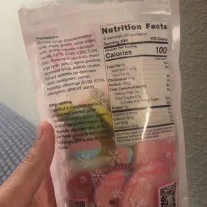 Glucose syrup, glucose-fructose syrup, sugar, gelatin, acids (malic, citric), acidity regulators (sodium malates, E270, E296, E330, E350, E500), humectant (glycerol), invert sugar syrup, gelling agent (pectins), caramelized syrup, sodium citrates, fruit and vegetable concentrates (radish, blackcurrant, carrot), flavourings, colourings (E100, E133, anthocyanins), wheat starch.