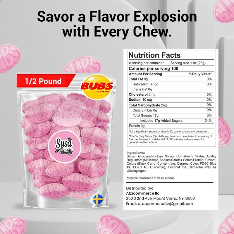 Introducing the Bubs Swedish Candy - Strawberry Pomegranate Foam Ovals, a delightful treat for any occasion. Each pack contains 1/2 pounds of these candy, perfect for enjoying as a sweet snack or a delightful treat for yourself.