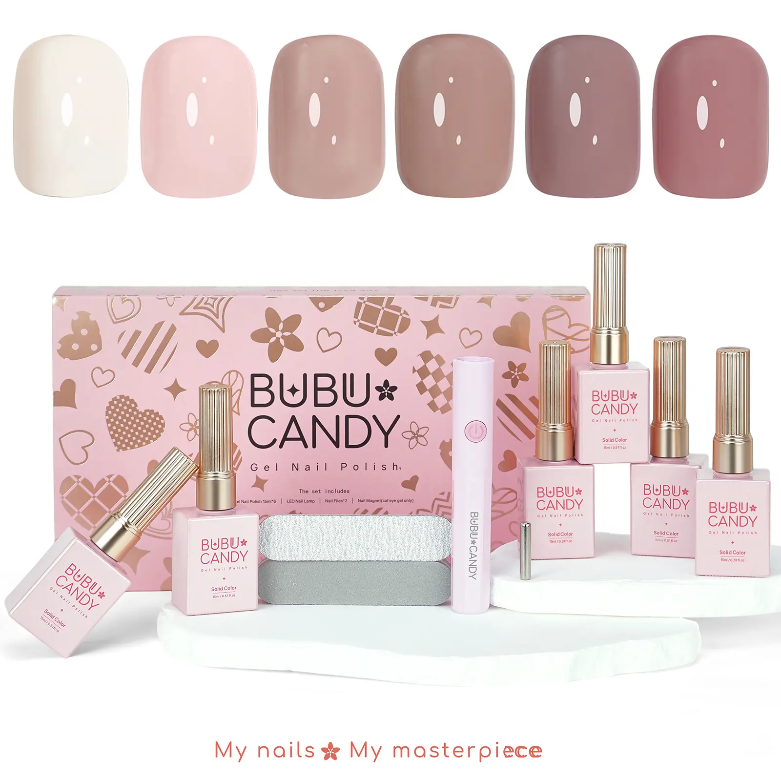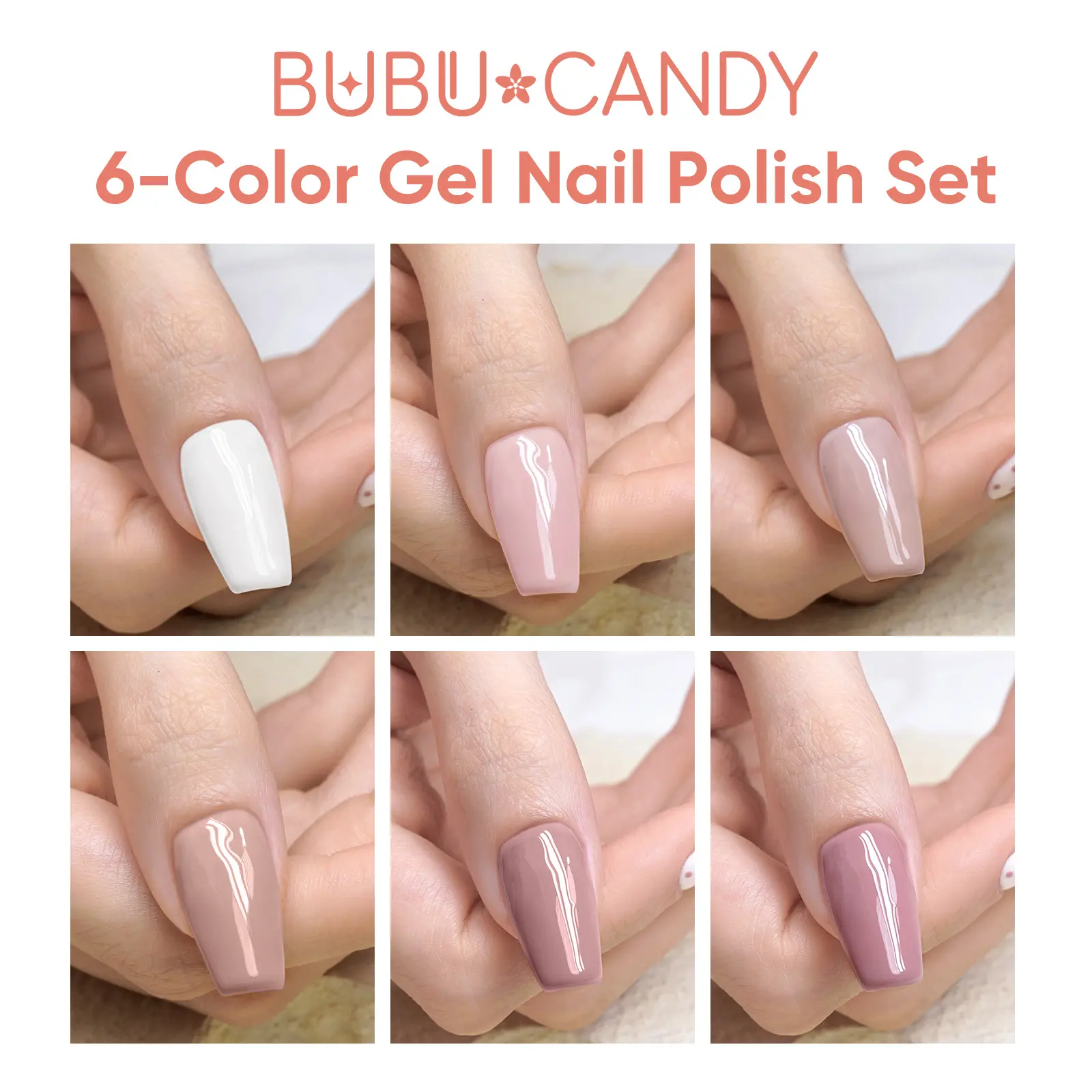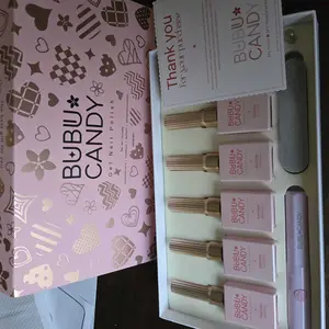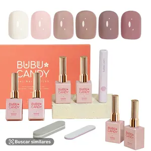 This BUBU CANDY set includes 6pcs of gel nail polish, each 15ml. Choose from Milk White, Mousse White, Bare Pink, Latte Bare, CL Bare, and Peach Pink. Perfect for everyday and special occasions, this non-toxic polish lasts 21-28 days. Comes with LED light, nail files, and a magnet.