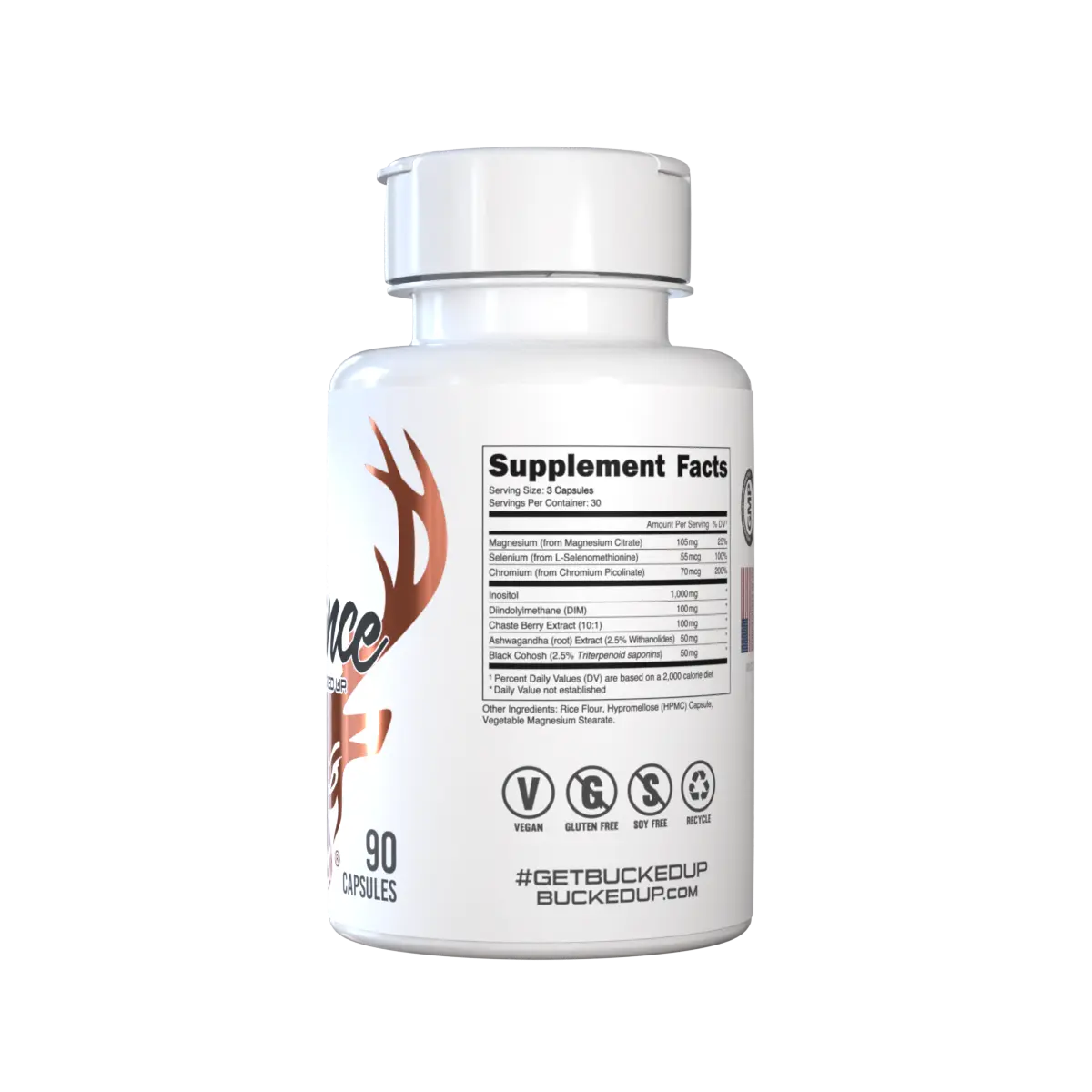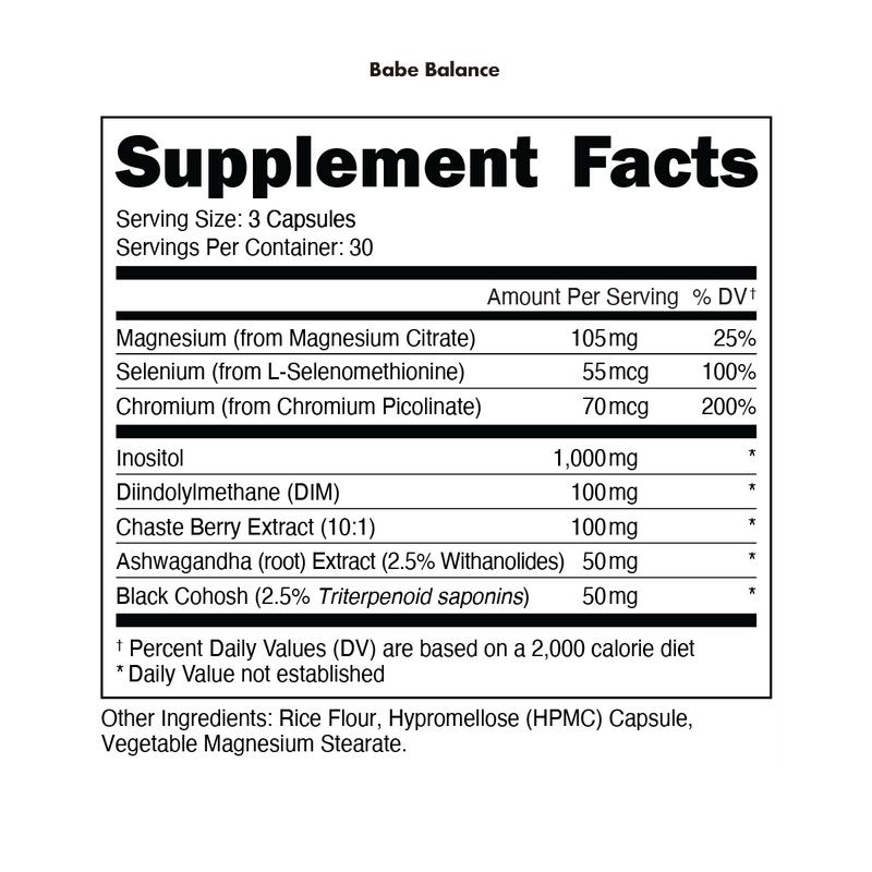 Serving Size: 3 Capsules. Servings Per Container: 30. Amount Per Serving: Magnesium - 105mg, Selenium - 55mcg, Chromium - 70mcg, Inositol - 1,000mg, Diindolylmethane - 100mg, Chaste Berry Extract - 100mg, Ashwagandha - 50mg, Black Cohosh - 50mg. Other Ingredients: Rice Flour, Hypromellose (HPMC) Capsule, Vegetable Magnesium Stearate.