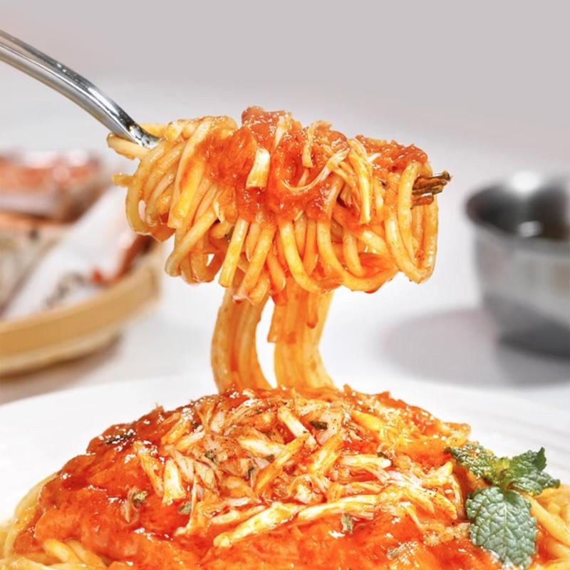·Boil the pasta in water for 12-15 minutes, then drain and rinse with cold water for a firmer texture.First Method: After draining the pasta, discard the cooking water and add red curry sauce and crab meat. Stir-fry for 1 minute, then add cheese, parsley, a sprinkle of black pepper, and sweet-and-sour pineapple sauce.Second Method: After draining the pasta, add red curry sauce and crab meat in sequence, then mix in cheese, parsley, a sprinkle of black pepper, and sweet-and-sour pineapple sauce. Stir well and enjoy.