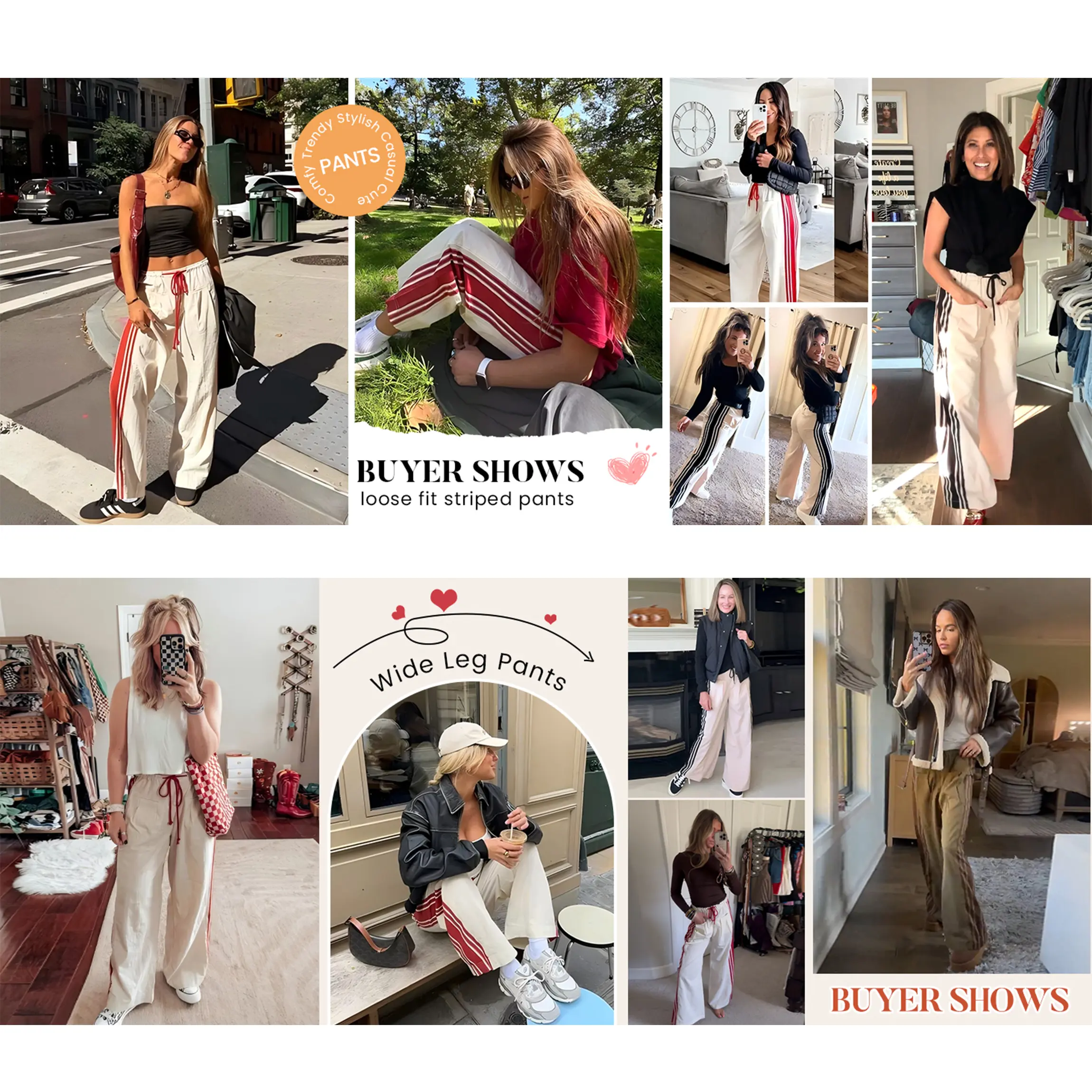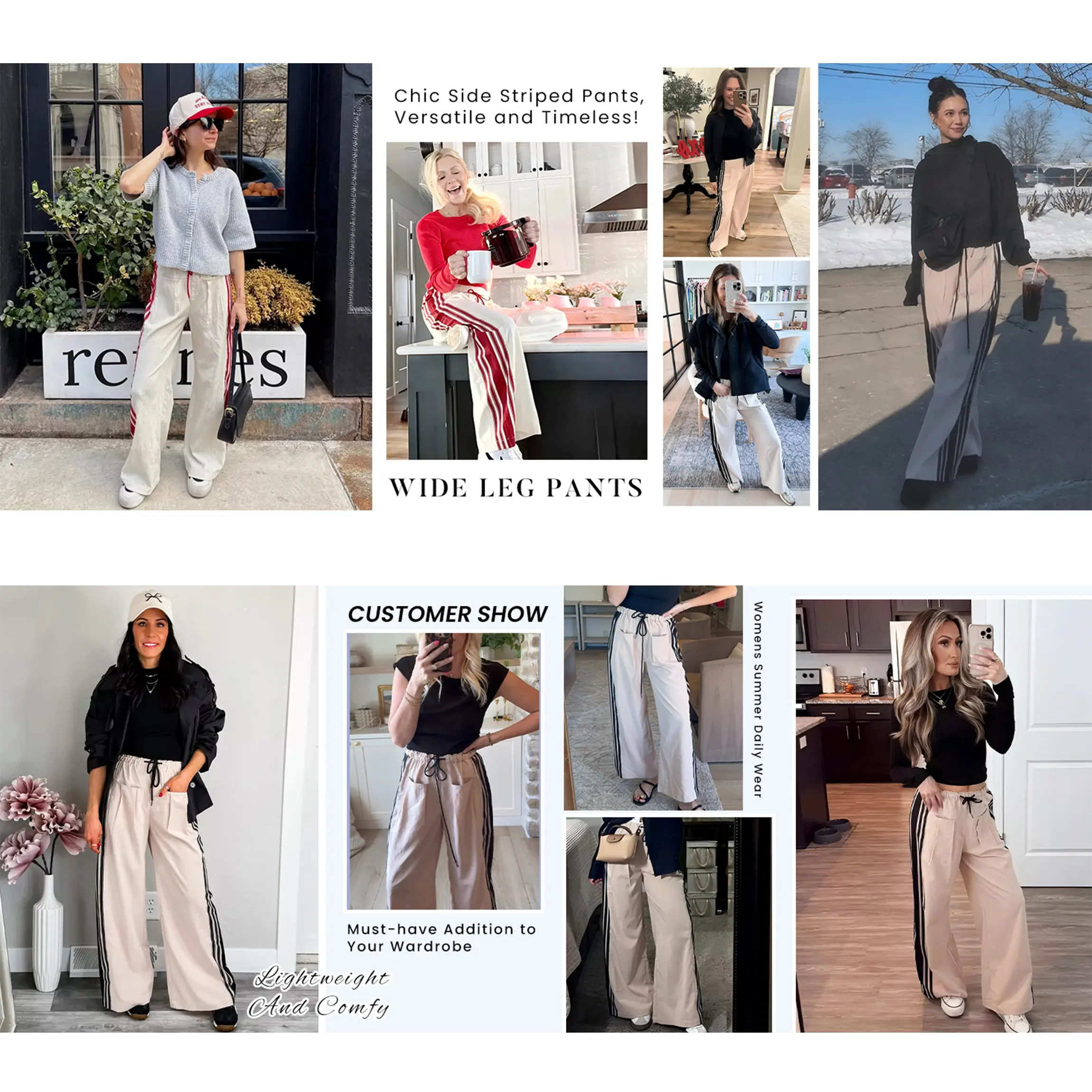 These wide leg striped pants are the perfect mix of sporty and chill. Designed with contrast side stripes to elongate your legs and a comfy elastic waistband with drawstring — they look effortlessly stylish whether you’re running errands, traveling, or hanging out.