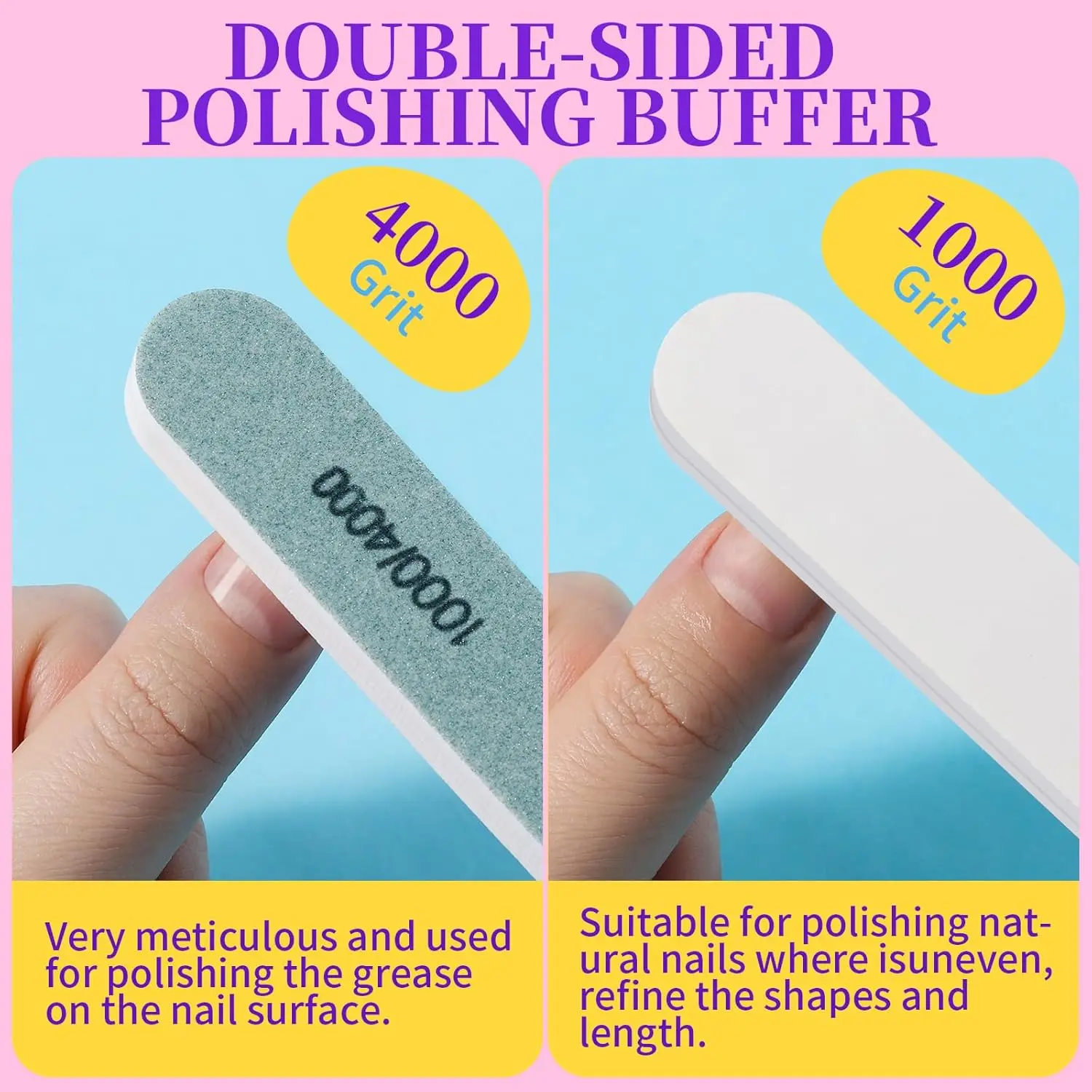 Buffers For Nails: The coarse buffers with 60 grit, 80 grit, 100 grit are suitable for filing thick, hard nails, gel nails, dip nails an so on. Coarse grit in buffer is visible to the human eye. For removing hard top coats or helping gel remove, play a main role in shape making at same time!