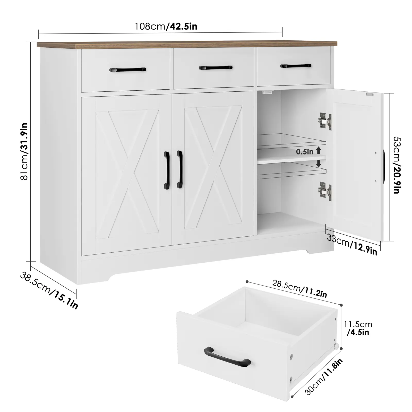 - Two Bottom Cabinets: Each with an internal shelf for smart storage of mugs, extra dishware, and other essentials.