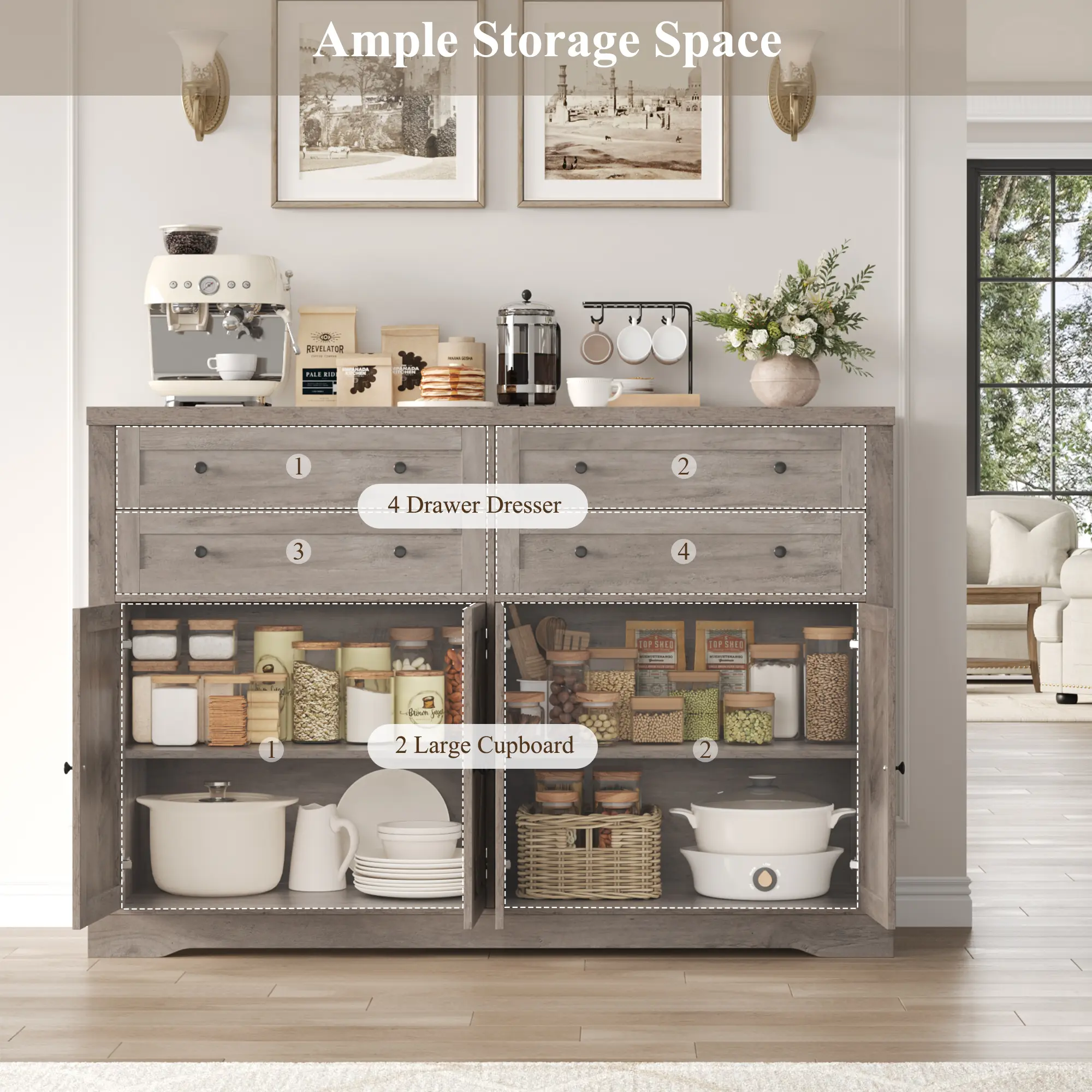 ·Large Cupboard: Features 4 doors with 2 adjustable shelves, offering customizable storage for tableware and appliances.