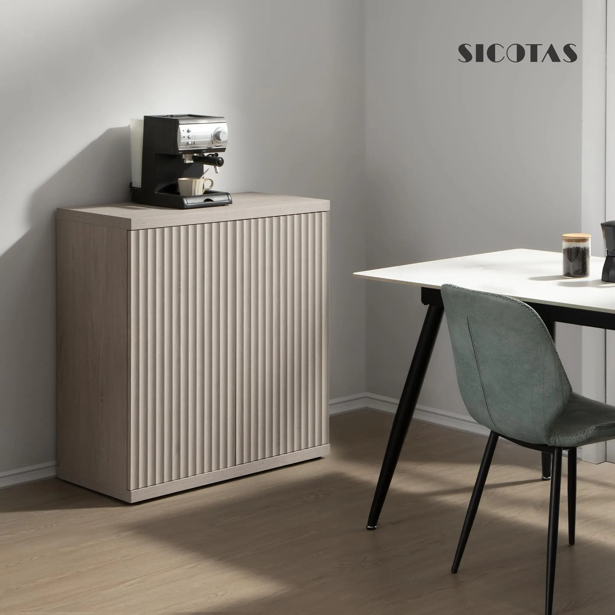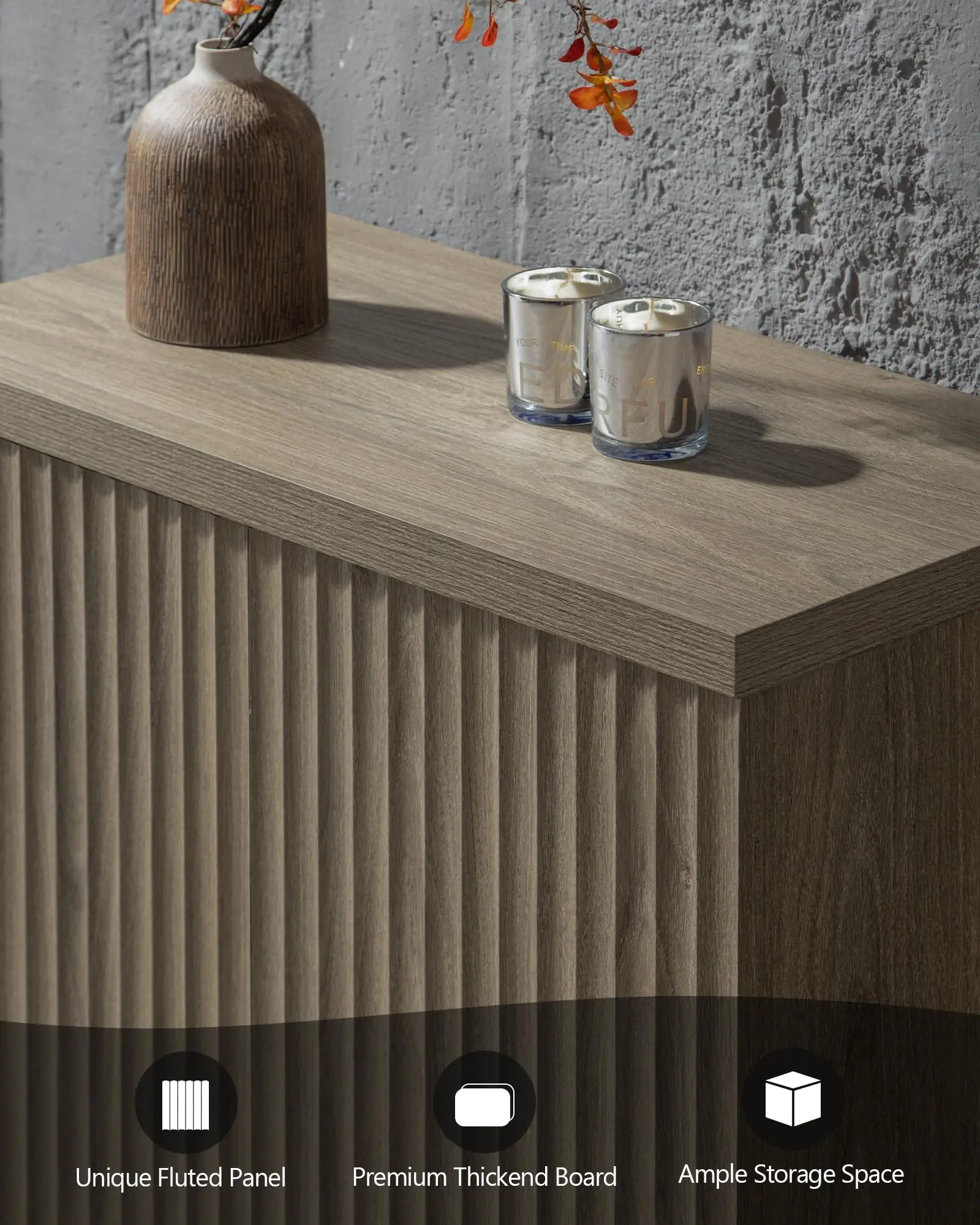 ·【Minimalist & Practical】- The storage cabinet boasts a minimalist profile and doors with a unique waveform panel, setting it apart from ordinary furniture pieces. Equipped with pop-up design doors that offer easy access to stored items while maintaining a sleek and seamless appearance. This distinctive design adds a touch of sophistication and style to your living space, enhancing the overall aesthetic appeal of your home decor.