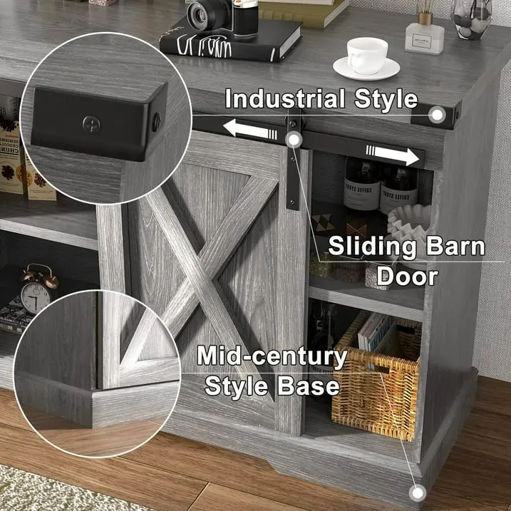 Multi-Function Coffee Bar Cabinet: The farmhouse style combines vintage elements with modern design. It serves as a coffee cabinet, kitchen storage cabinet, or TV stand. Easy to clean, the cabinet includes numbered accessories for quick assembly. Contact us for any issues, and we'll assist you promptly.