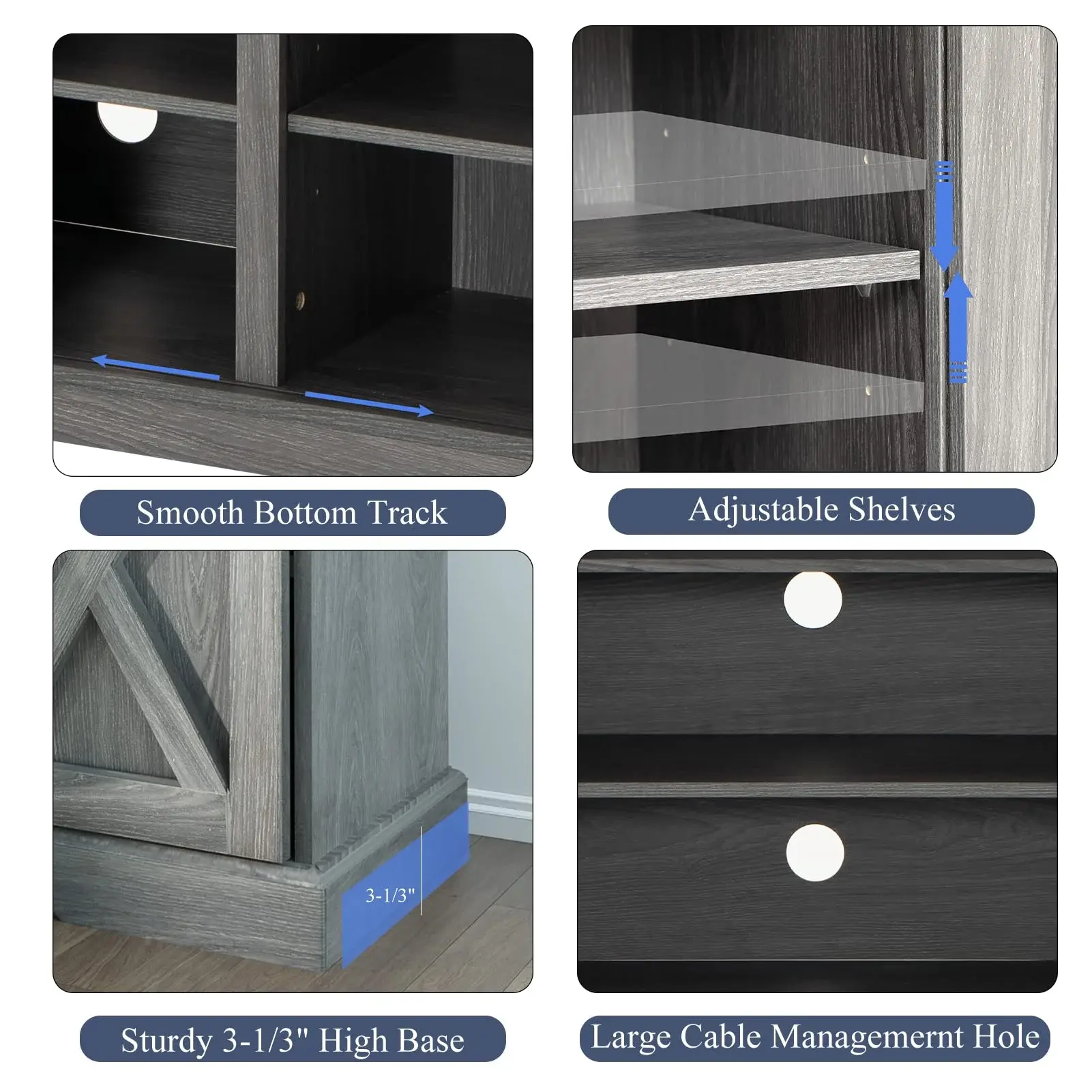 Adjustable Storage Shelves: Equipped with 3 adjustable shelves, this buffet cabinet provides flexible storage. Adjust the shelves up or down by 2.5 inches or remove them for more space. Unload the center clapboard for a larger open space, fitting appliances like a 23-inch or 36-inch fireplace or large coffee machine.