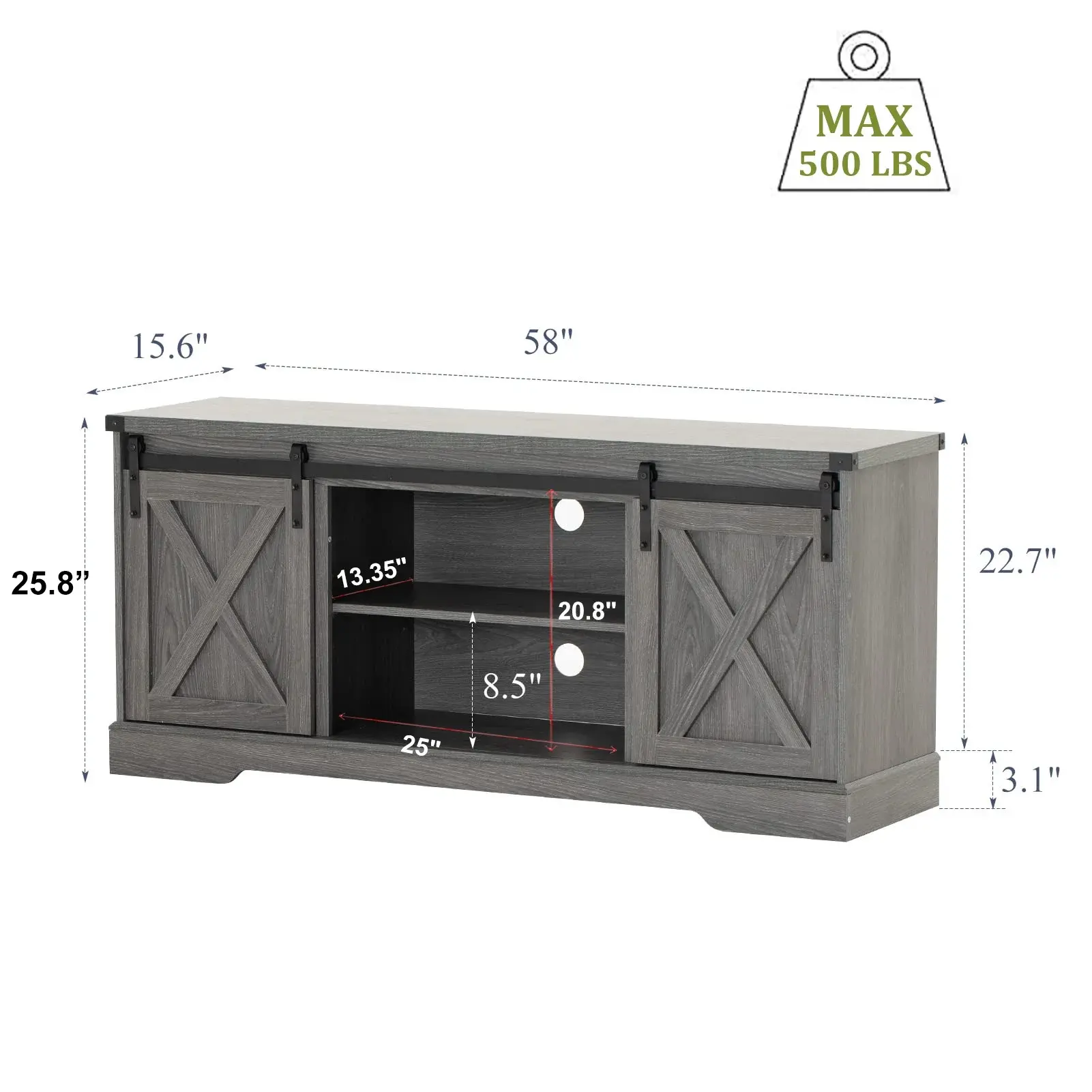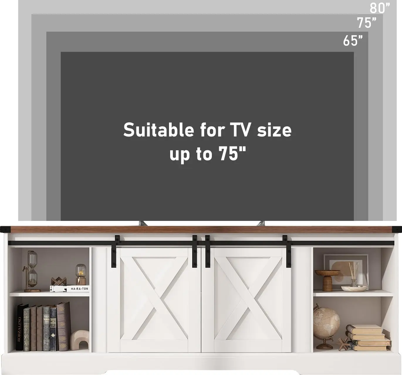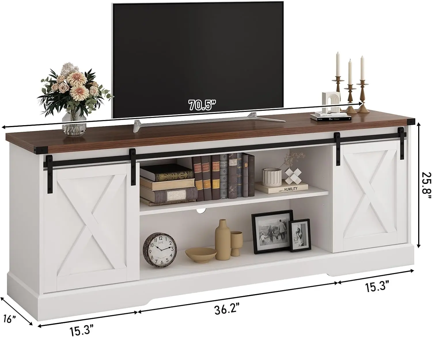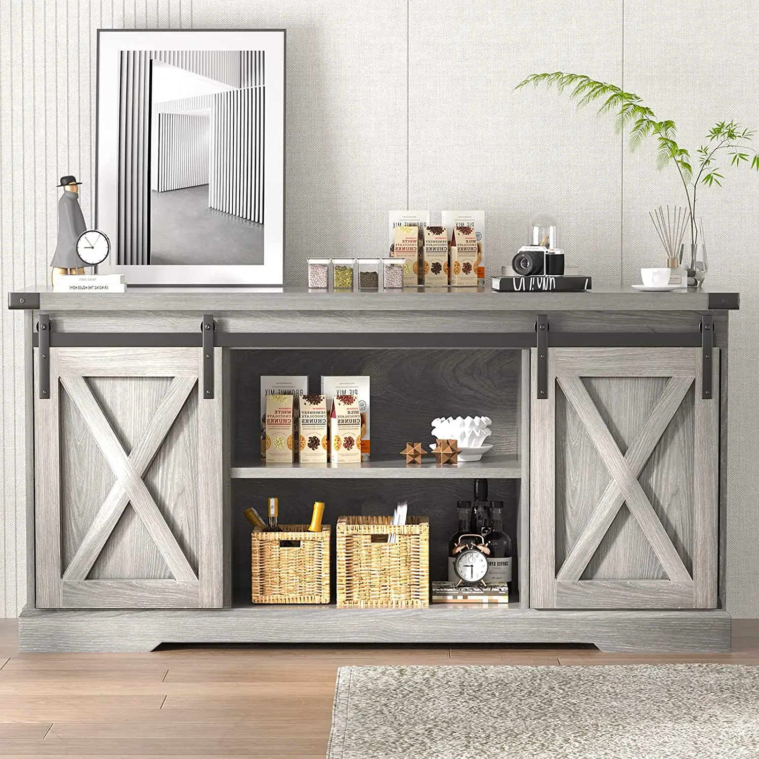 Bar Cabinet with Barn Doors: This farmhouse coffee bar cabinet is crafted from the finest wood grain surface. It features barn doors that slide easily, supported by durable black iron bars. This ensures smooth operation and aesthetic appeal. Place it in a prominent spot to display your collection by sliding the barn door.