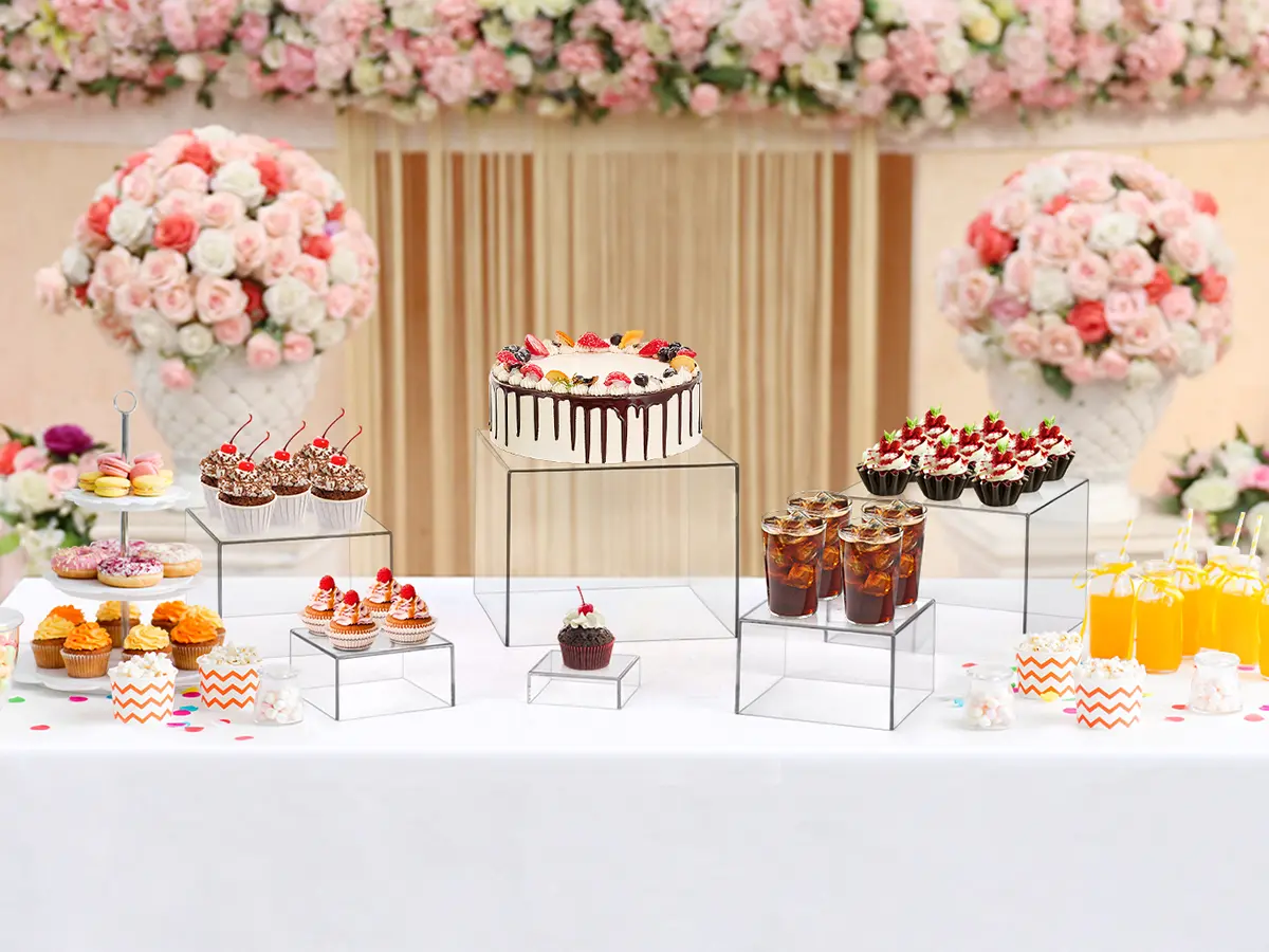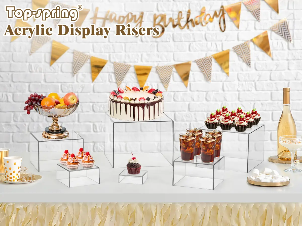 Premium Acrylic Risers: Crafted from premium acrylic, these acrylic display risers offer a sleek surface that wipes clean easily. The sturdy structure provides reliable support for various items, such as cake stands, dessert stands, food risers for buffet table, figure or jewelry display stands.