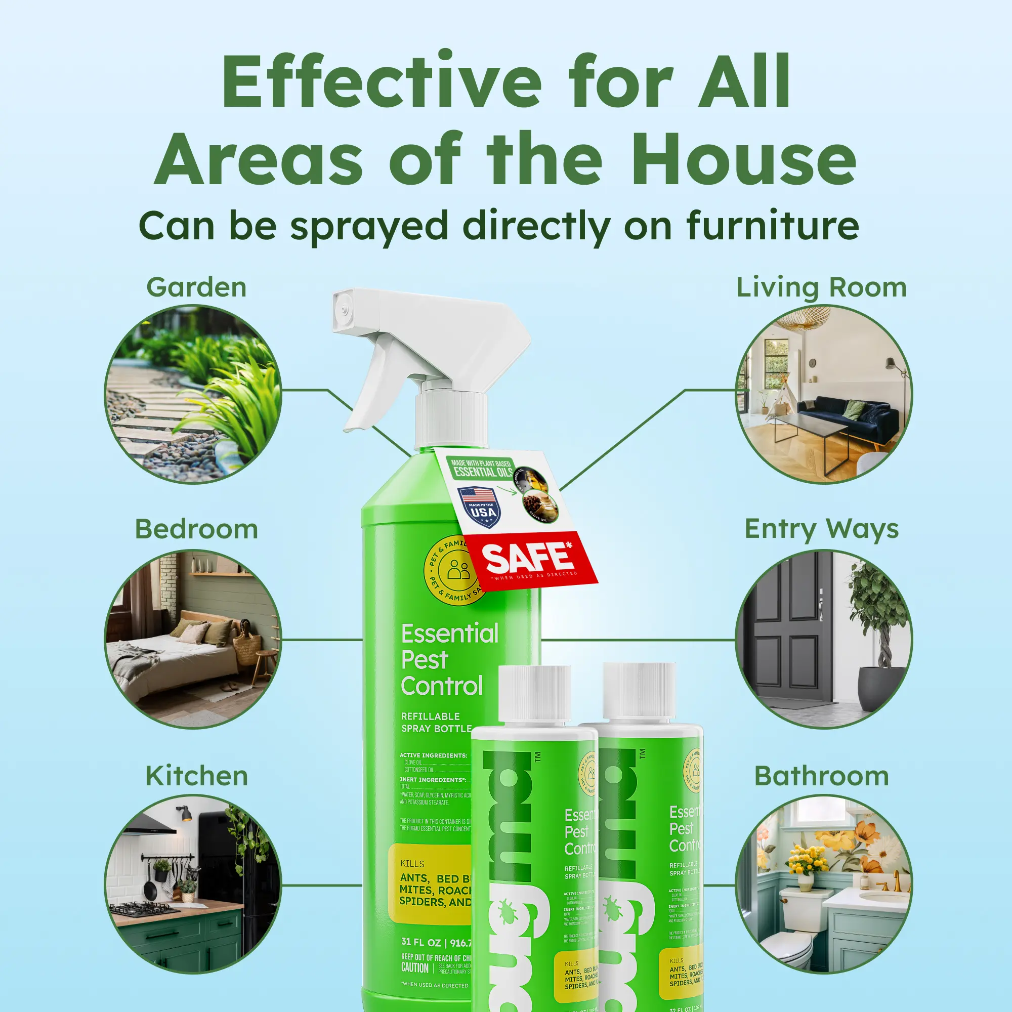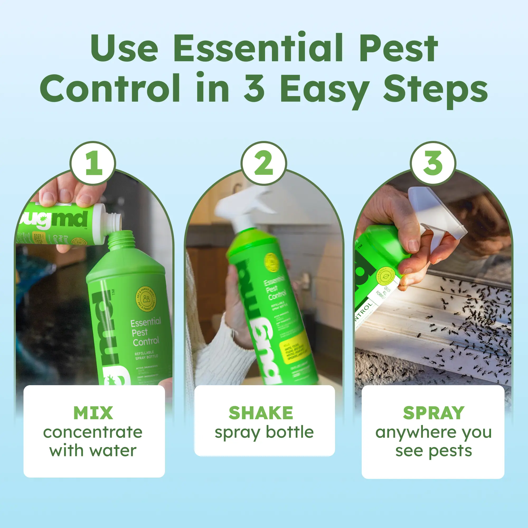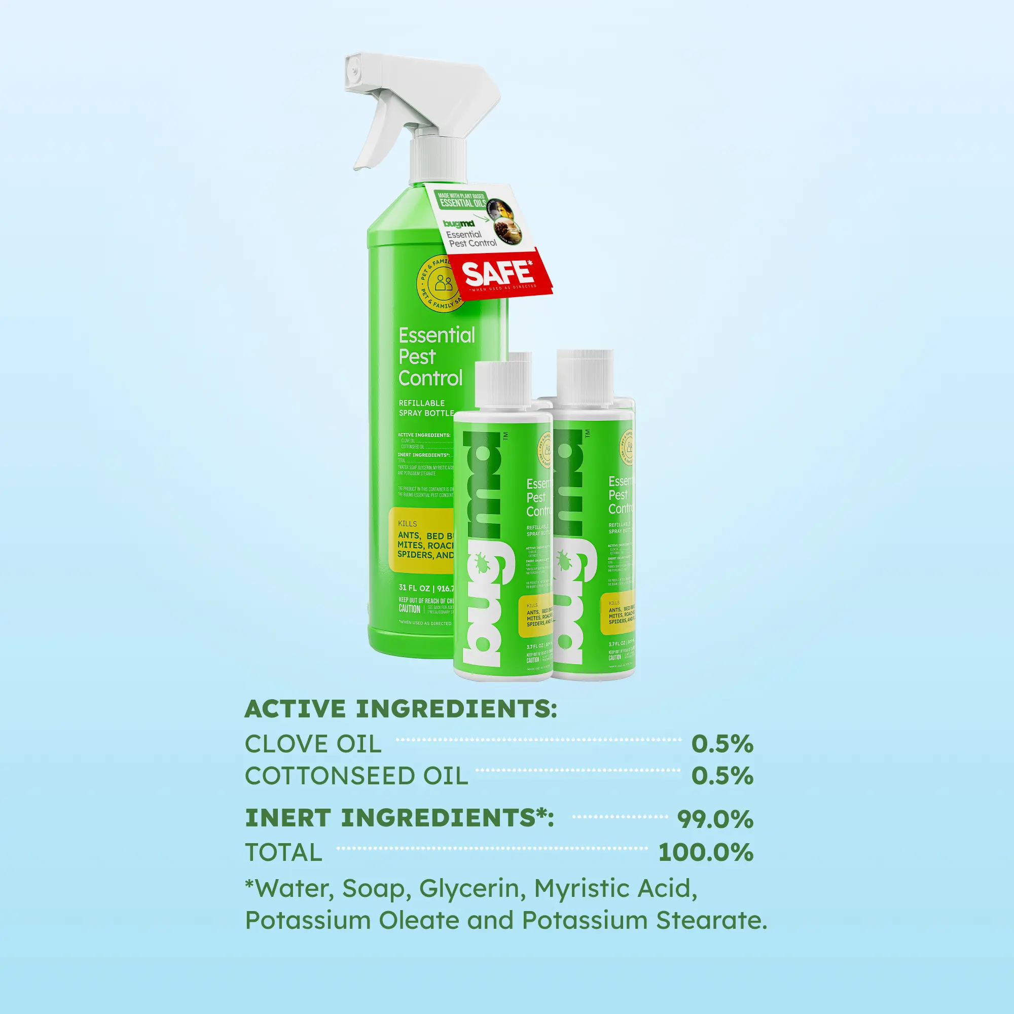 ·Includes 4 Essential Pest concentrate bottles plus a reusable BUGMD “Forever” spray bottle for home and outdoor use.