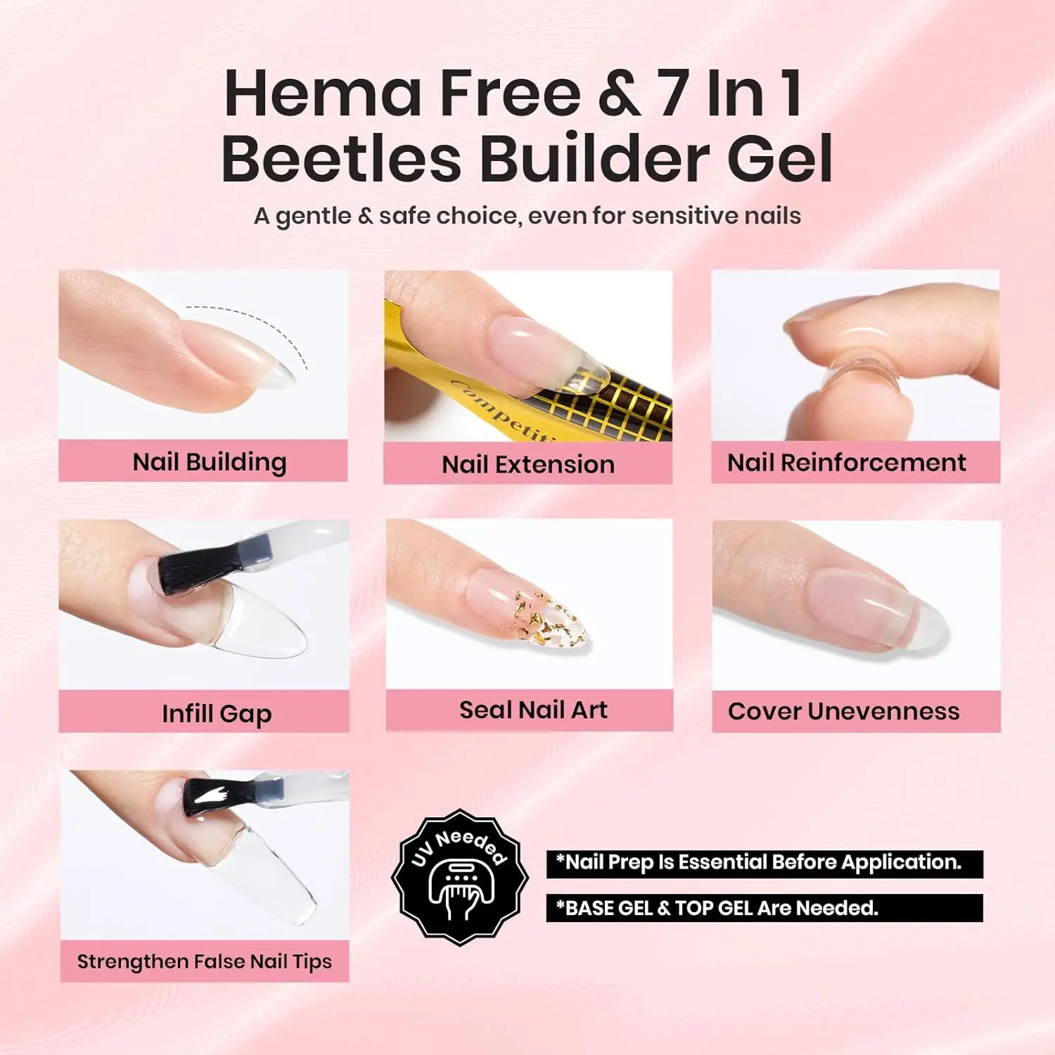 ·Beetles 7 in 1 Builder Gel Set: This Building Nail Gel Set includes 1×15ml hema-free builder gel with upgraded bottle & 9mm short brush and a nail thread pen. It can be used for building apex, nail extension, nail strengthen, rhinestone gel, seal nail art. Suitable for DIY manicure and nail salon use.