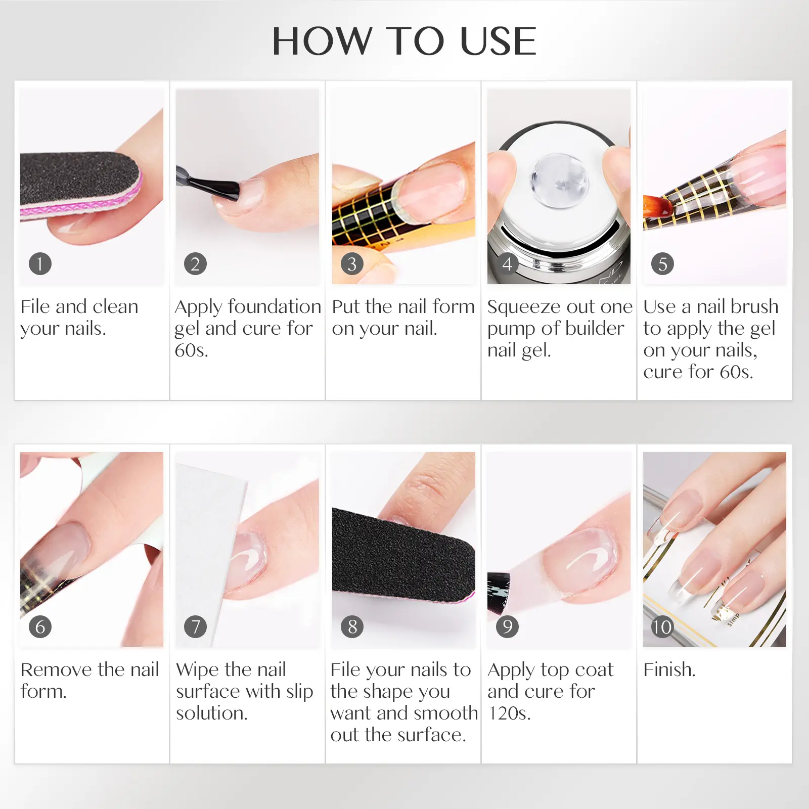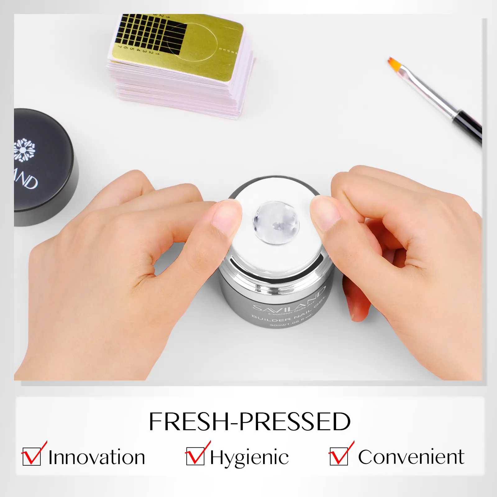 Air-Cushion Design: The Saviland builder nail gel features an innovative air-cushion top, allowing gel to dispense easily and cleanly—just push down to get the right amount. This stylish, convenient design helps maintain a clean workspace while creating flawless, clear nails. The set includes 30ml (1.05 fl oz) builder gel, 100 nail forms, and a nail brush—everything you need for high-quality results.