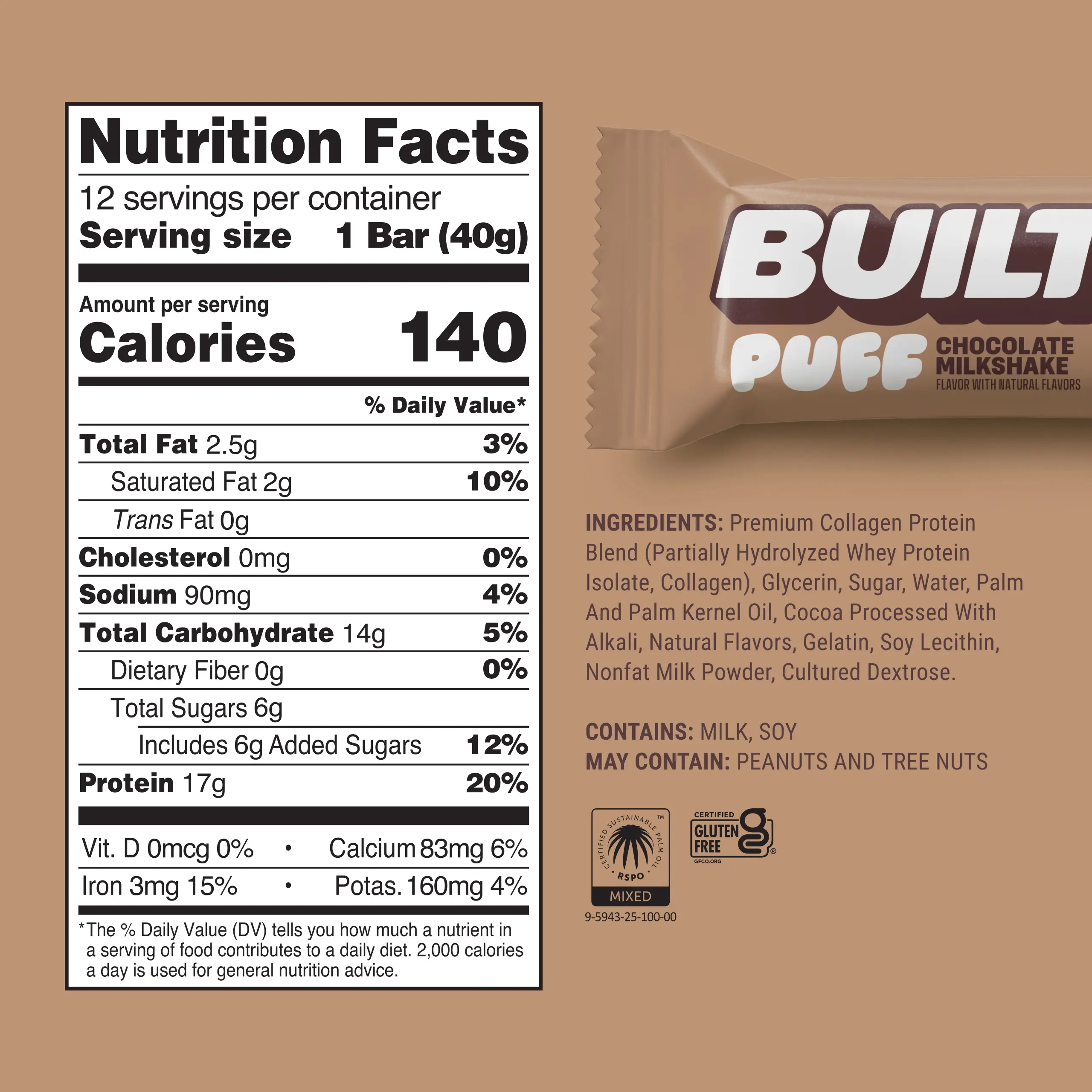 Premium Collagen Protein Blend (Partially Hydrolyzed Whey Protein Isolate, Collagen), Glycerin, Sugar, Water, Palm and Palm Kernel Oil, Cocoa Processed with Alkali, Natural Flavors, Gelatin, Soy Lecithin, Nonfat Milk Powder, Cultured Dextrose