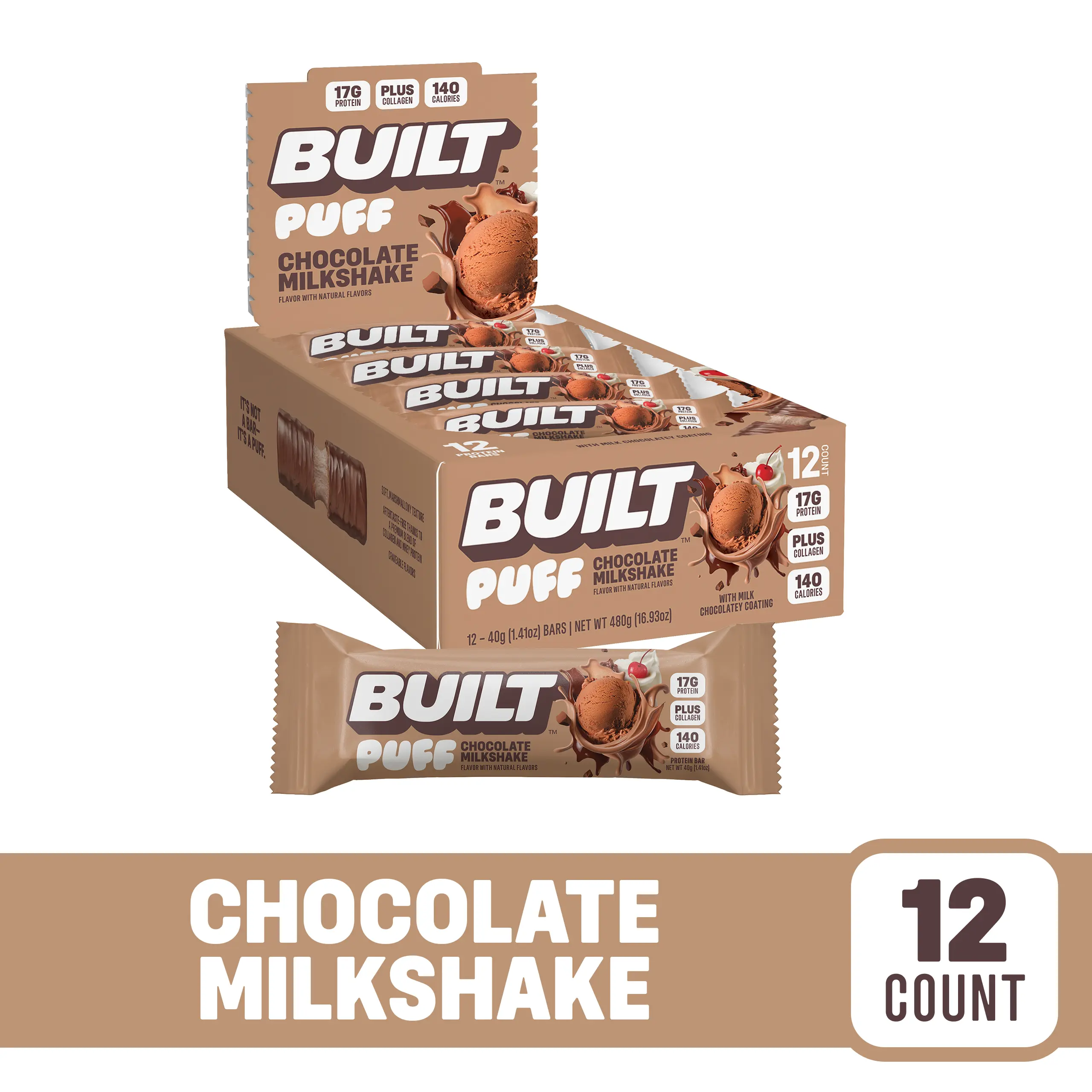 Introducing BUILT Bar's latest treat – the Chocolate Milkshake Puff! Formerly known as Creamy Milk Chocolate, this fluffy, cloud-like puff is the ultimate snack for chocolate lovers. Wrapped in a decadent milk chocolatey coating, it offers a rich, indulgent taste. Perfect for those craving a chocolate milkshake flavor without the guilt.