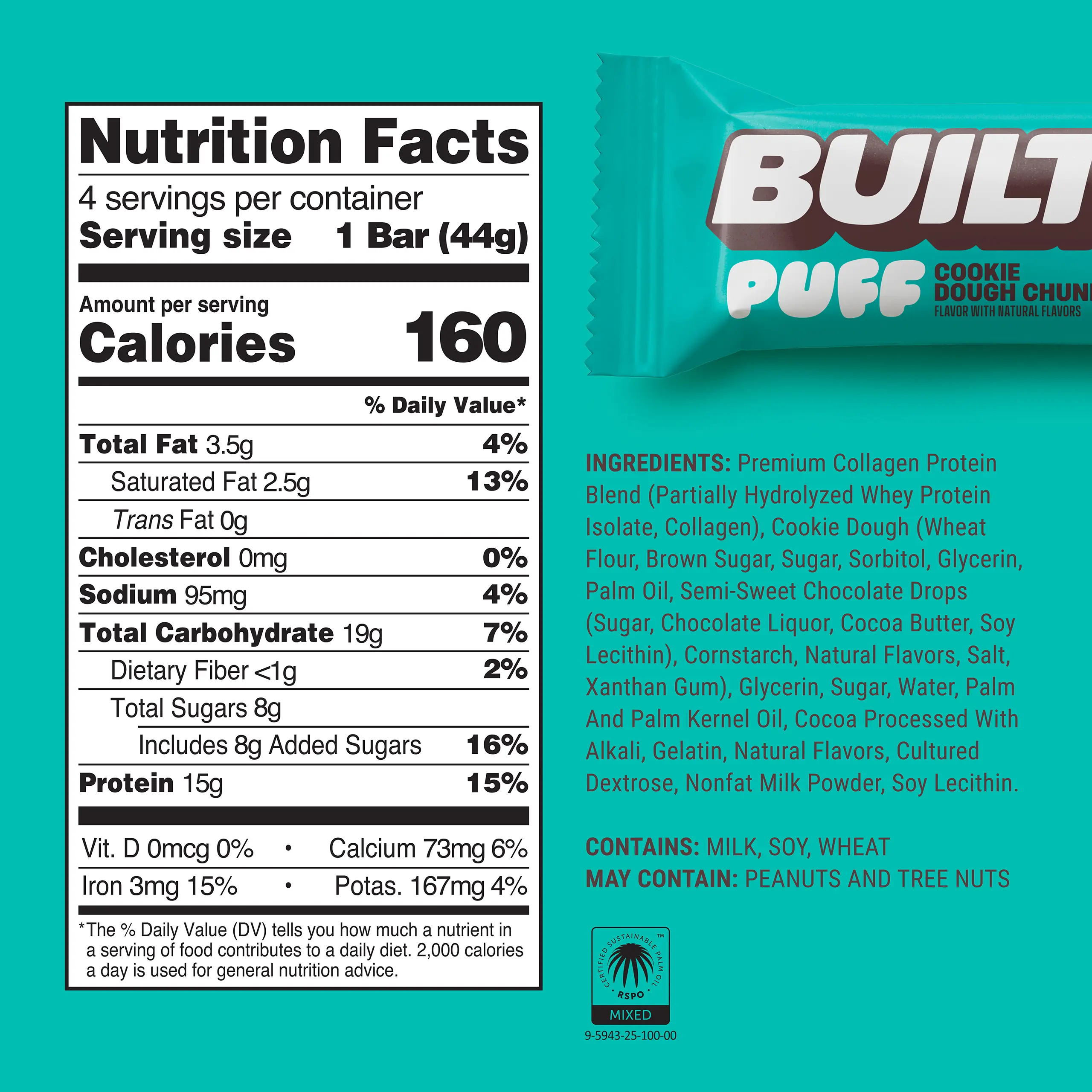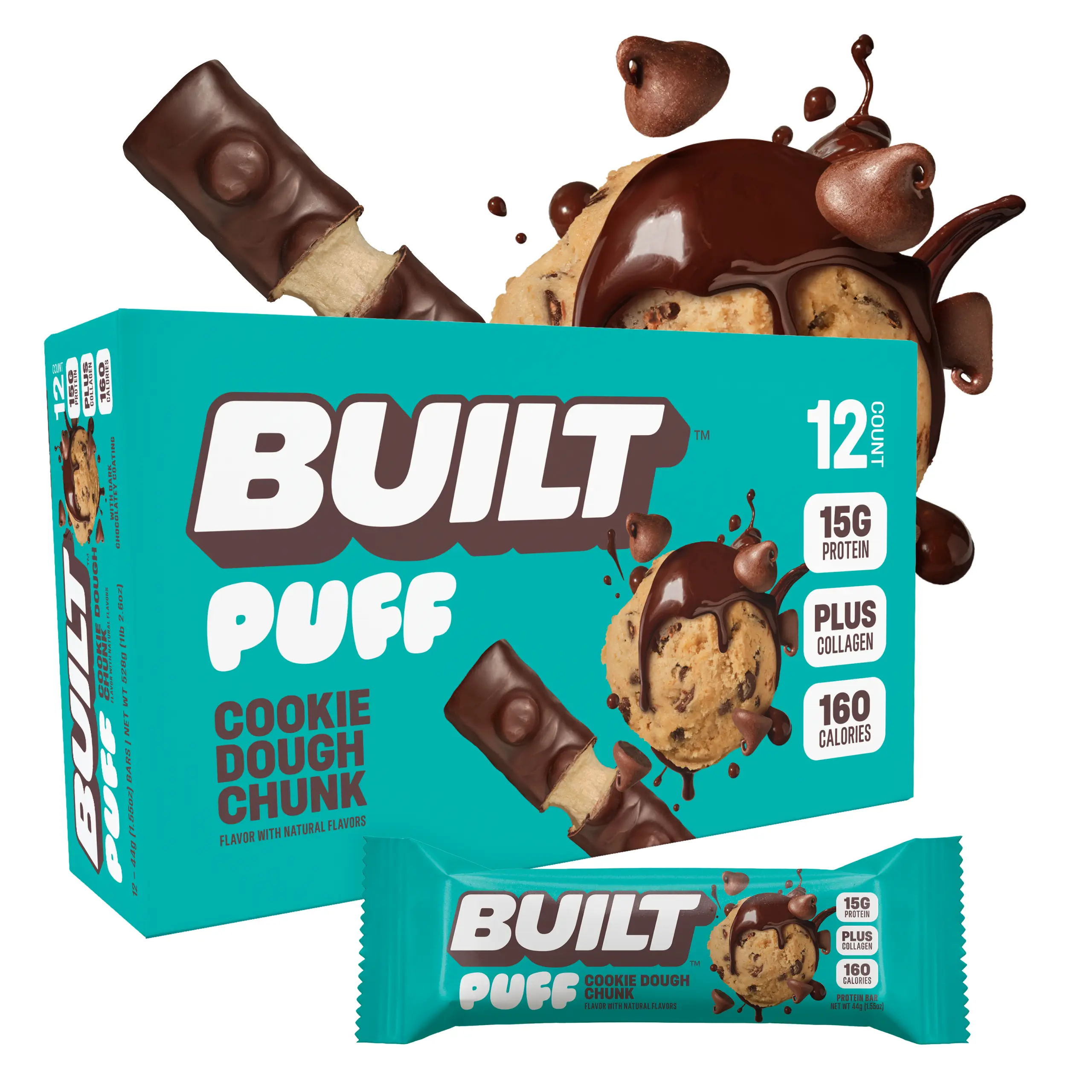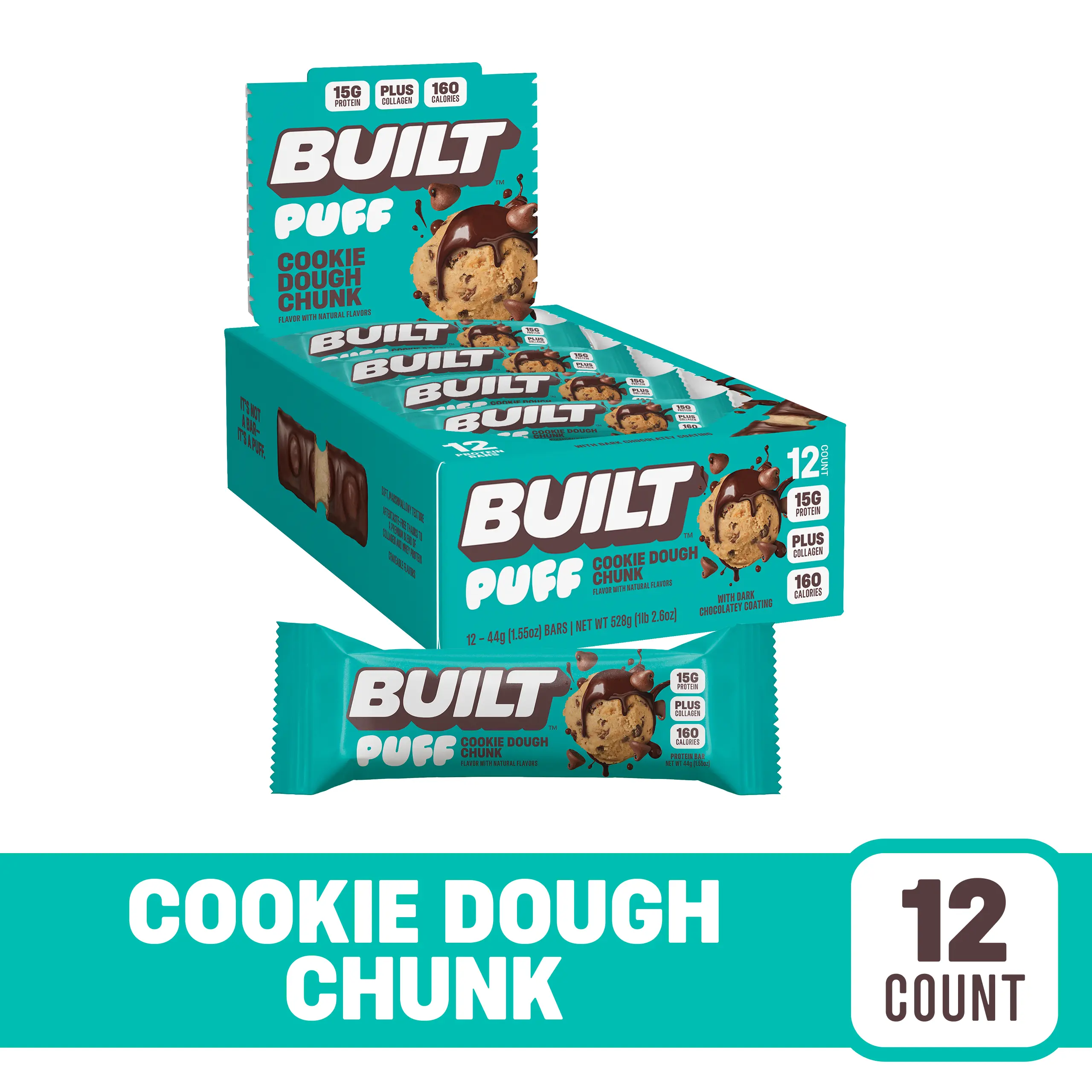 Satisfy your sweet tooth with BUILT Bar's Cookie Dough Chunk Puff Protein Candy Bar, featuring a soft, fluffy cookie dough-flavored center, topped with real cookie dough pieces and covered in dark chocolatey goodness.