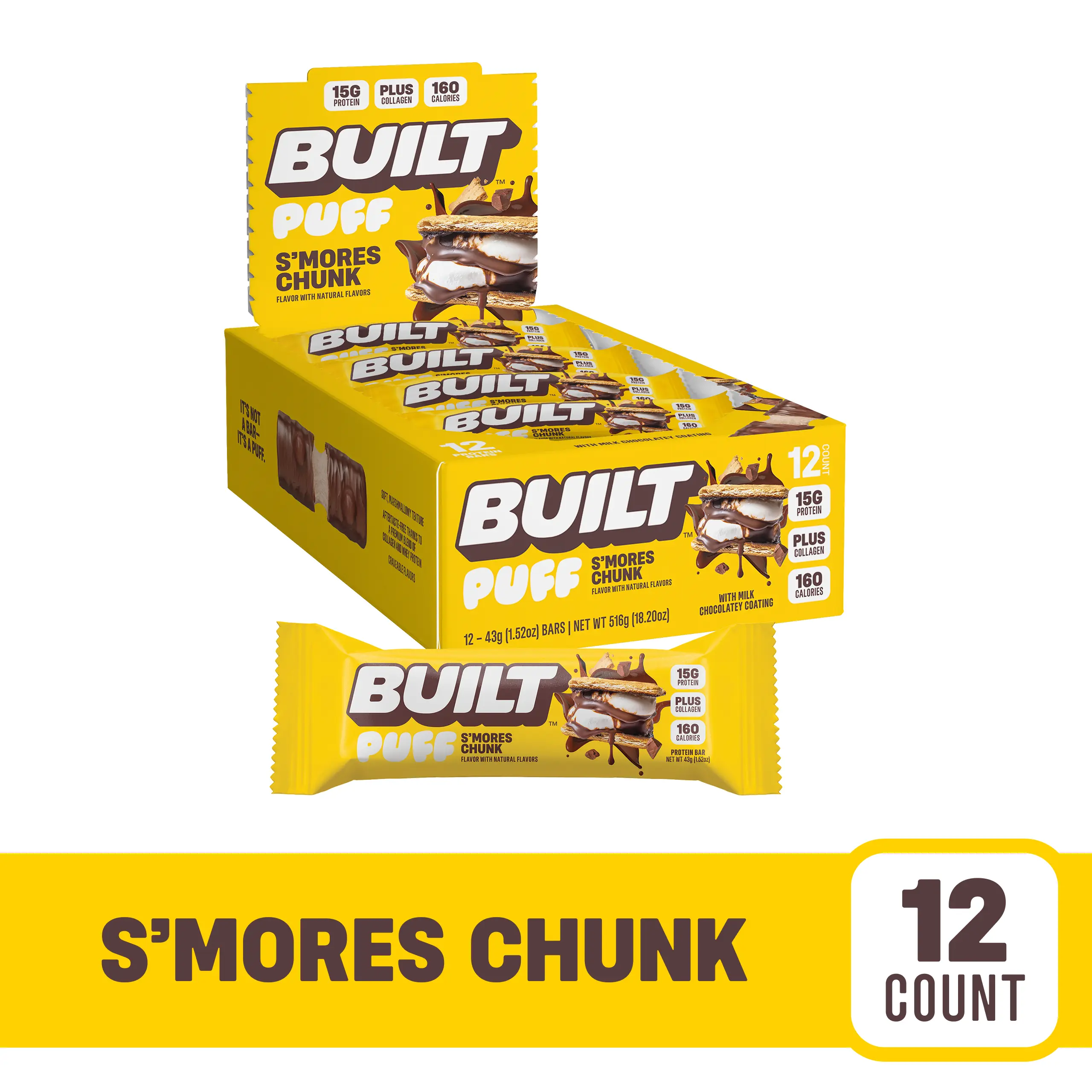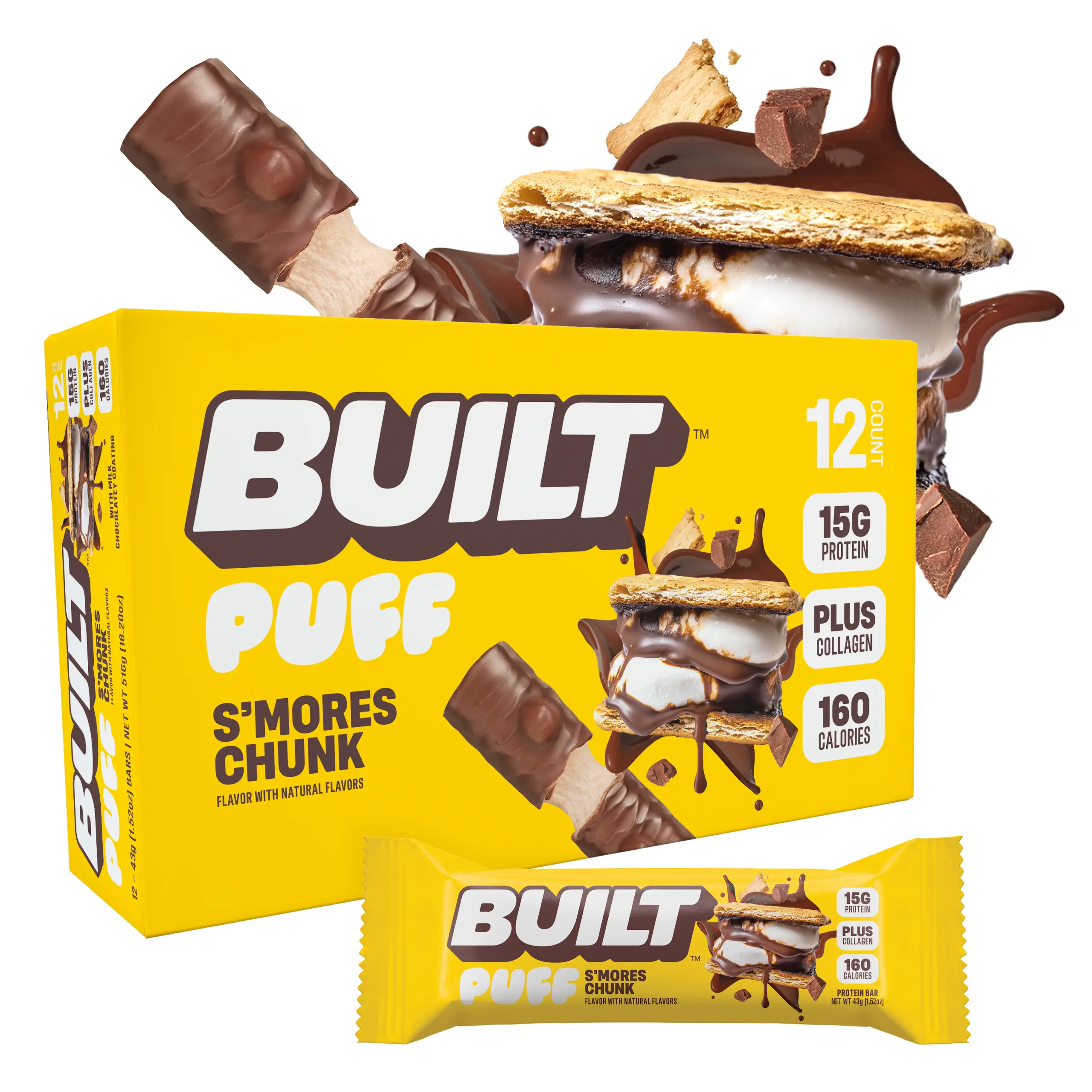 Get ready to relive campfire memories with BUILT Bar's S'mores Puff Protein Bar, the perfect treat for sâmores lovers. This light and fluffy snack combines the rich taste of chocolatey and gooey marshmallow with real chunks of graham cracker on top, bringing you all the delicious flavors of a classic s'more without the mess. Packed with high-quality protein, itâs the ideal choice for a post-workout treat, a midday pick-me-up, or a guilt-free dessert.