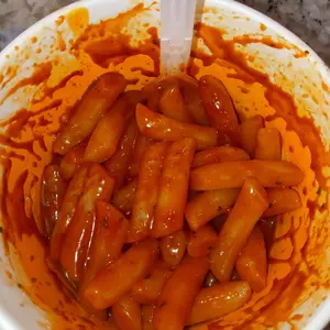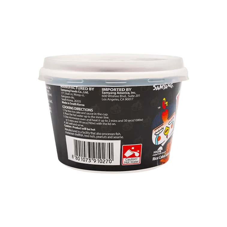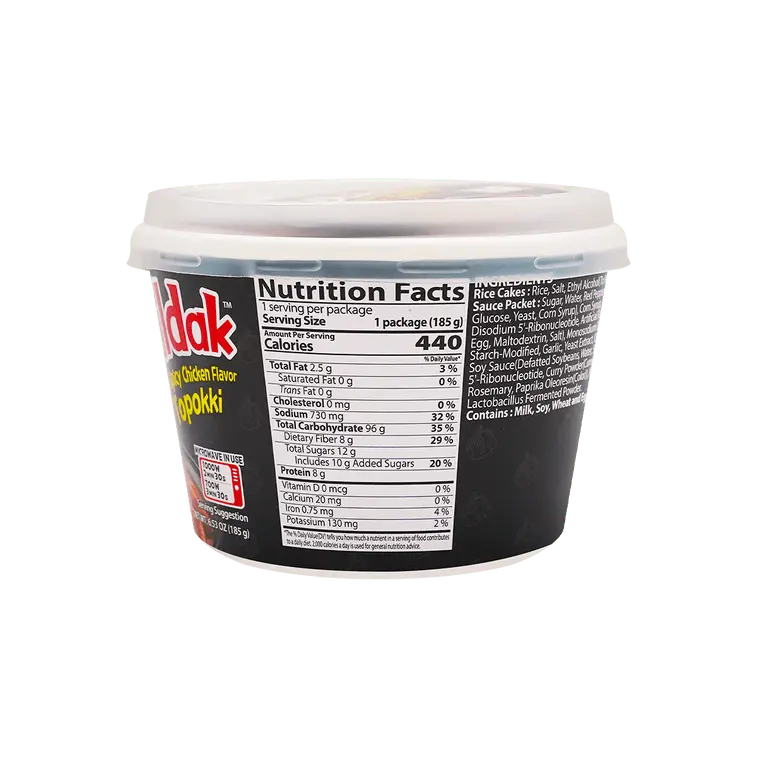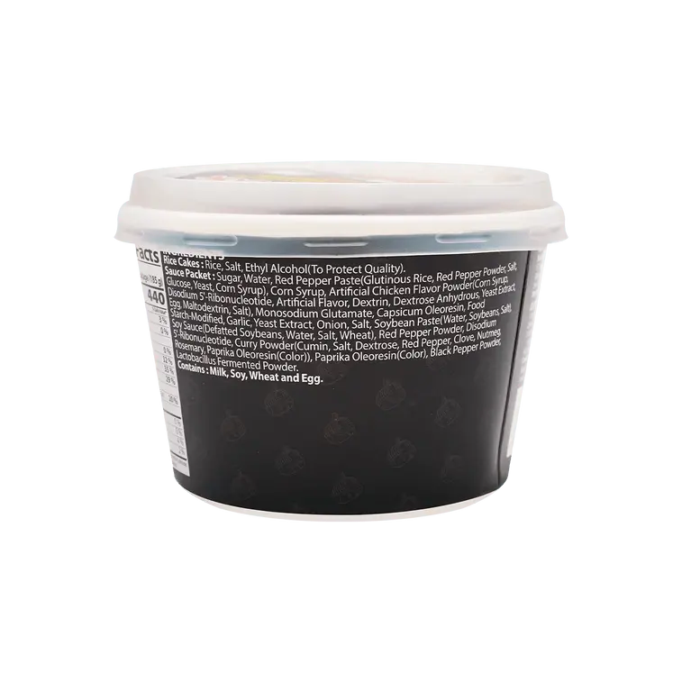 | Ingredients | Rice Cake (83.8%): Rice, Refined Salt, Acidity Regulator [Citric Acid (E330)], Ethyl AlcoholSauce (8.9%): Water, Artificial Chicken Flavour, Soy Sauce, White Sugar, Chilli Pepper Powder, Red Pepper Powder, Soybean Oil, Onion, Red Pepper Seed Oil, Flavour Enhancer [Monosodium L-Glutamate (E621)], Garlic, Modified Potato Starch, Decolourised Chilli Extract, Paprika Extract, Black Pepper Powder, Curry Powder.Powder (7.3%): Whole Milk Powder, Non Dairy Creamer, Mozzarella Cheeese Powder, Garlic Powder, Butter Powder, Modified Potato Starch, White Sugar, Artificial Chicken Flavour Powder, Soybean Oil, Decolourised Chilli Extract, Black Pepper Powder, Parsely Curly, Basil Powder. |