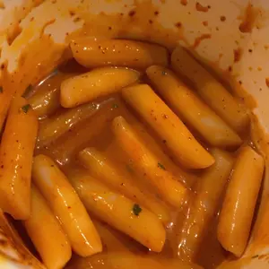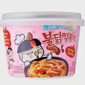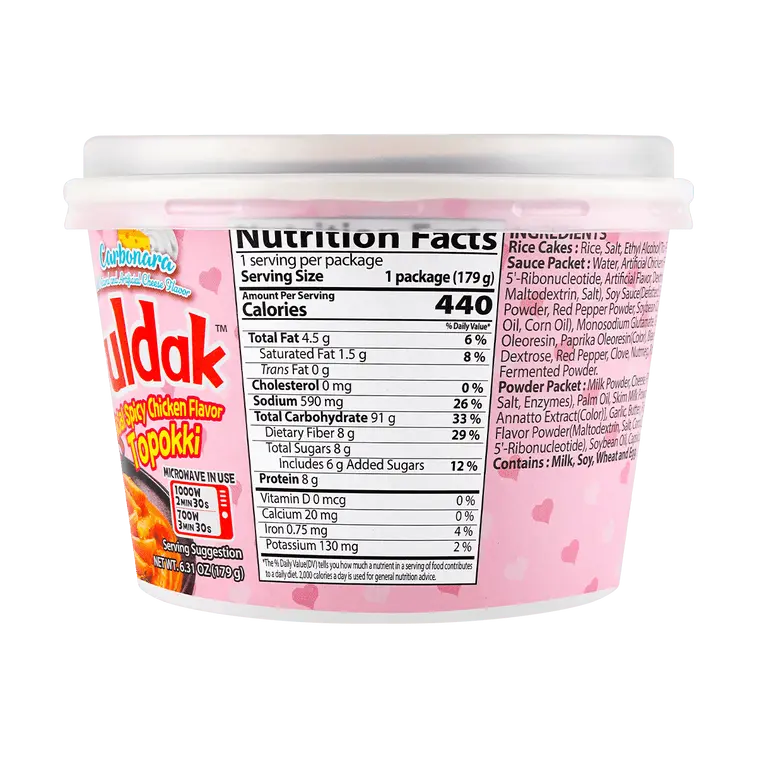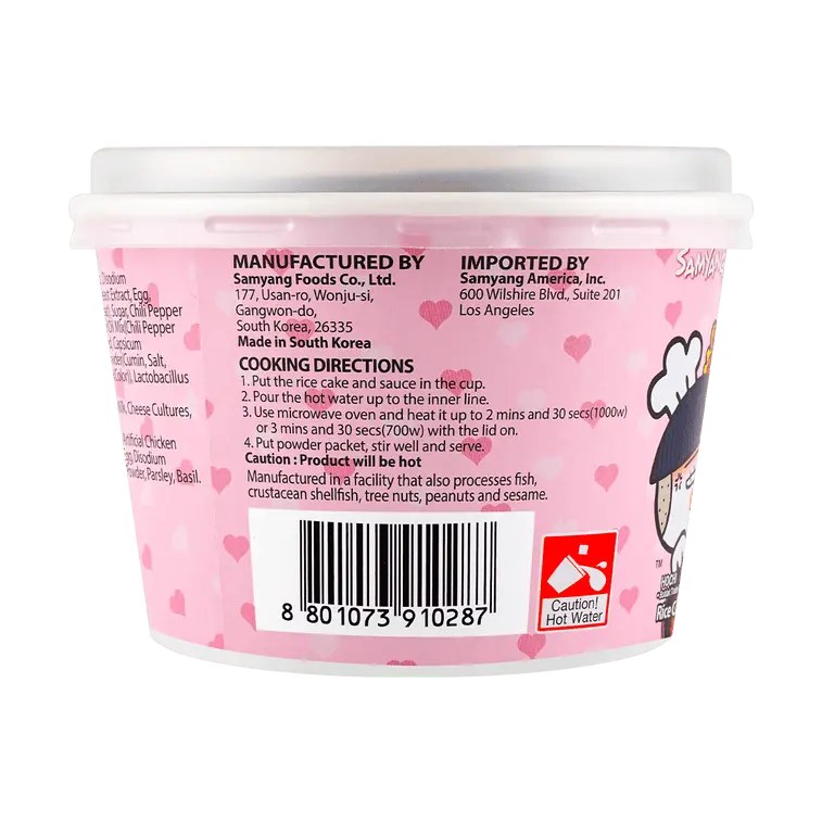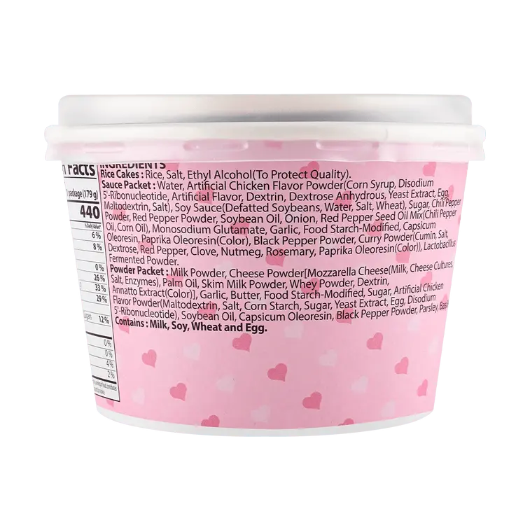 | Ingredients | Rice Cake (83.8%): Rice, Refined Salt, Acidity Regulator [Citric Acid (E330)], Ethyl AlcoholSauce (8.9%): Water, Artificial Chicken Flavour, Soy Sauce, White Sugar, Chilli Pepper Powder, Red Pepper Powder, Soybean Oil, Onion, Red Pepper Seed Oil, Flavour Enhancer [Monosodium L-Glutamate (E621)], Garlic, Modified Potato Starch, Decolourised Chilli Extract, Paprika Extract, Black Pepper Powder, Curry Powder.Powder (7.3%): Whole Milk Powder, Non Dairy Creamer, Mozzarella Cheeese Powder, Garlic Powder, Butter Powder, Modified Potato Starch, White Sugar, Artificial Chicken Flavour Powder, Soybean Oil, Decolourised Chilli Extract, Black Pepper Powder, Parsely Curly, Basil Powder. |