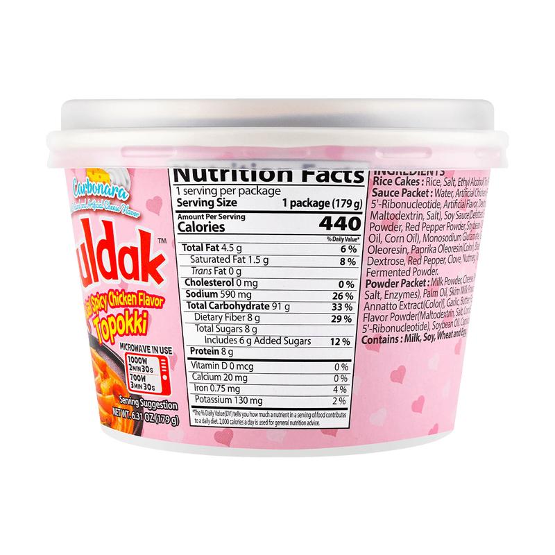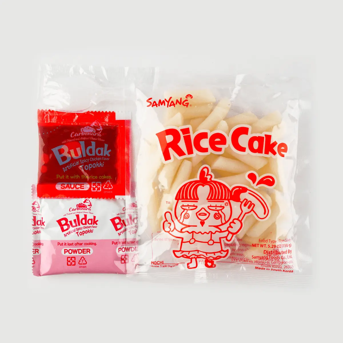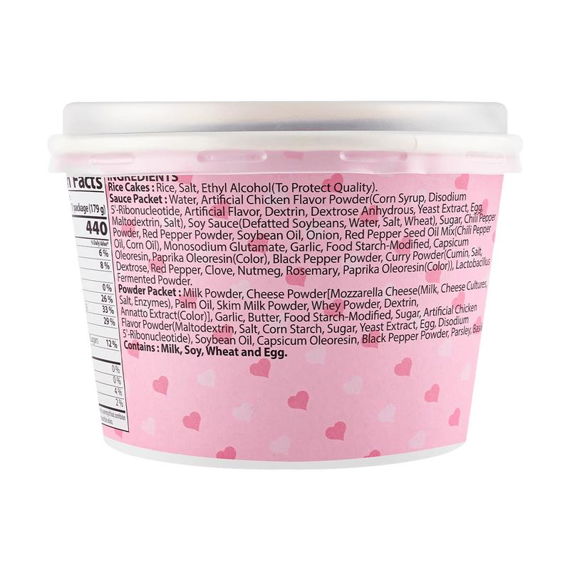·Rice Cake (83.8%): Rice, Refined Salt, Acidity Regulator [Citric Acid (E330)]Sauce (8.9%): Water, Artificial Chicken Flavour, Soy Sauce, White Sugar, Chilli Pepper Powder, Red Pepper Powder, Soybean Oil, Onion, Red Pepper Seed Oil, Flavour Enhancer [Monosodium L-Glutamate (E621)], Garlic, Modified Potato Starch, Decolourised Chilli Extract, Paprika Extract, Black Pepper Powder, Curry Powder. Powder (7.3%): Whole Milk Powder, Non Dairy Creamer, Mozzarella Cheeese Powder, Garlic Powder, Butter Powder, Modified Potato Starch, White Sugar, Artificial Chicken Flavour Powder, Soybean Oil, Decolourised Chilli Extract, Black Pepper Powder, Parsely Curly, Basil Powder.