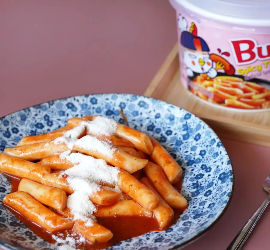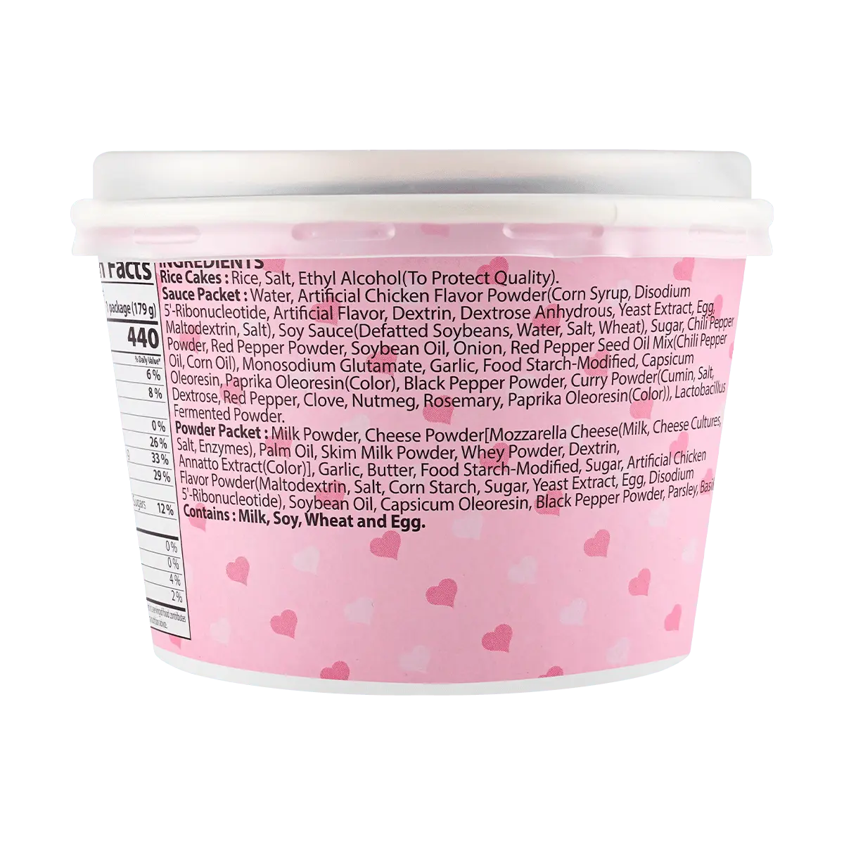 ·Rice Cake (83.8%): Rice, Refined Salt, Acidity Regulator [Citric Acid (E330)]Sauce (8.9%): Water, Artificial Chicken Flavour, Soy Sauce, White Sugar, Chilli Pepper Powder, Red Pepper Powder, Soybean Oil, Onion, Red Pepper Seed Oil, Flavour Enhancer [Monosodium L-Glutamate (E621)], Garlic, Modified Potato Starch, Decolourised Chilli Extract, Paprika Extract, Black Pepper Powder, Curry Powder. Powder (7.3%): Whole Milk Powder, Non Dairy Creamer, Mozzarella Cheeese Powder, Garlic Powder, Butter Powder, Modified Potato Starch, White Sugar, Artificial Chicken Flavour Powder, Soybean Oil, Decolourised Chilli Extract, Black Pepper Powder, Parsely Curly, Basil Powder.