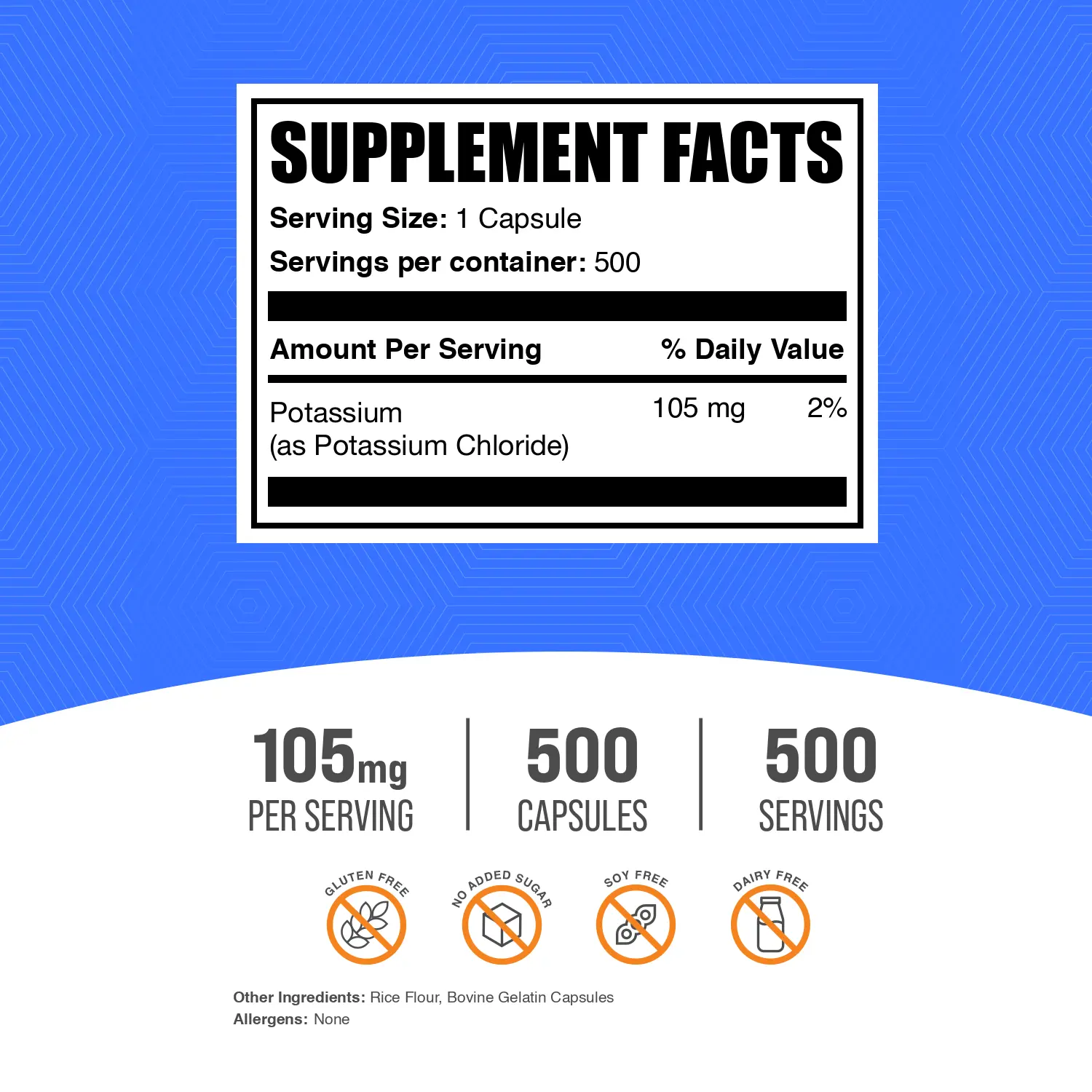 ✨ BulkSupplements Potassium Chloride 500 Capsules provide a reliable source of potassium. Each capsule contains 105mg, ensuring you get your daily dose effortlessly. These are perfect for those who need more hydration and muscle support.