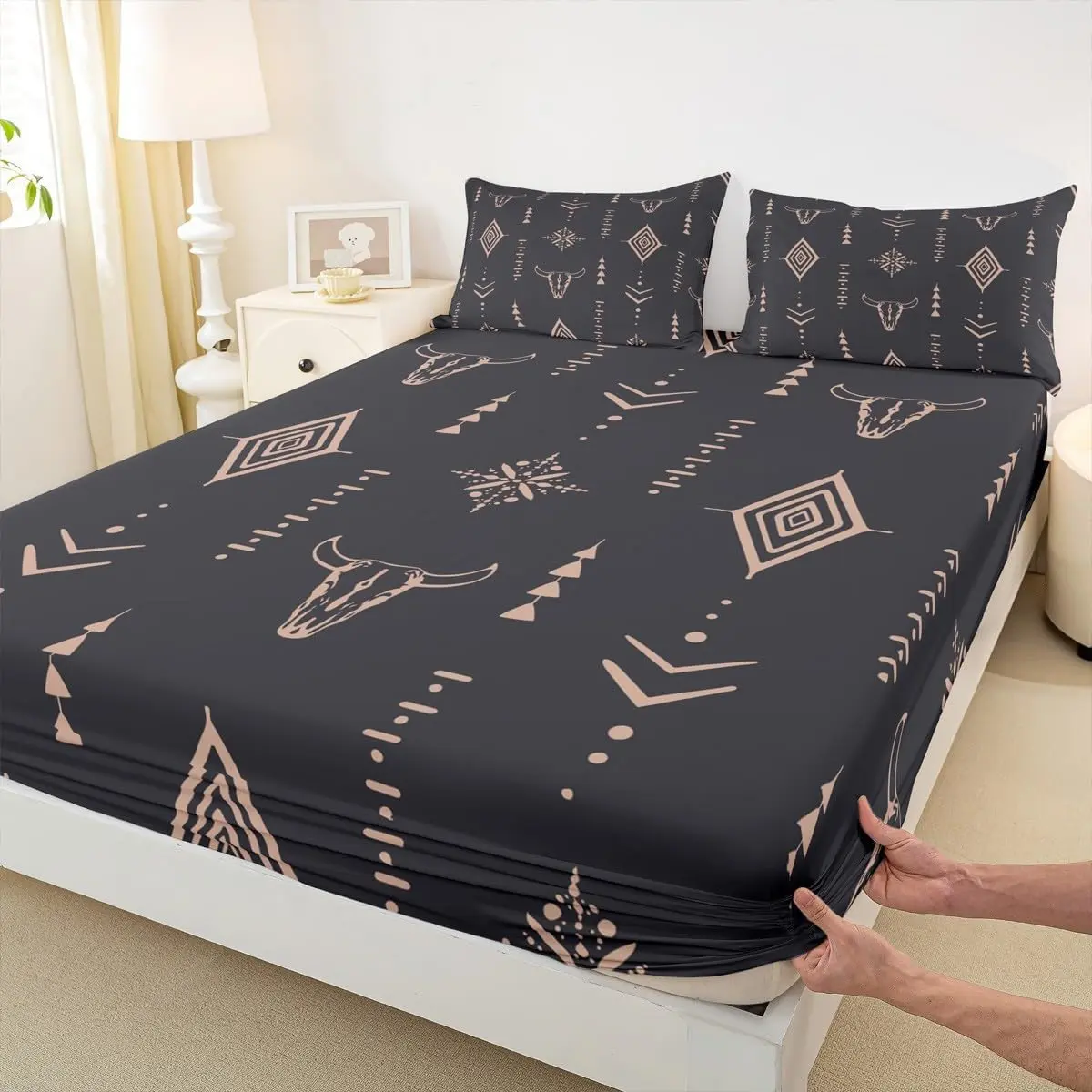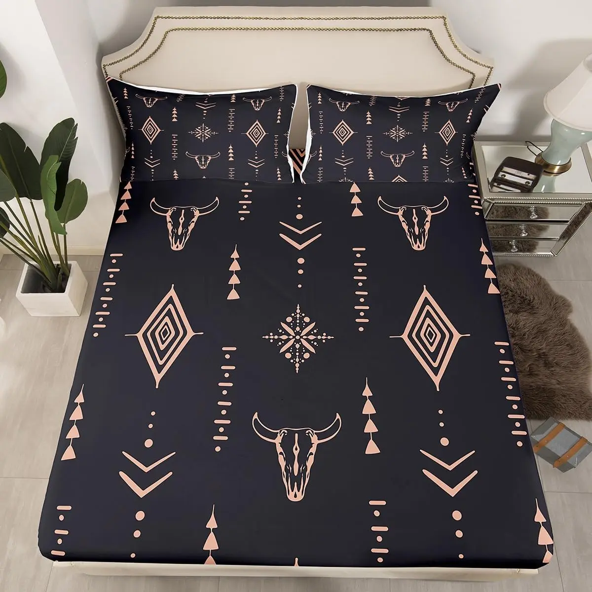Useful and Practical : This sheet set just has 16" Deep Pockets,no corner straps,is easy to match with your bed mattress,Sheets used Reactive Printing and dyeing process,clear pattern,the colors are rich and vibrant elegant way to update your bedroom