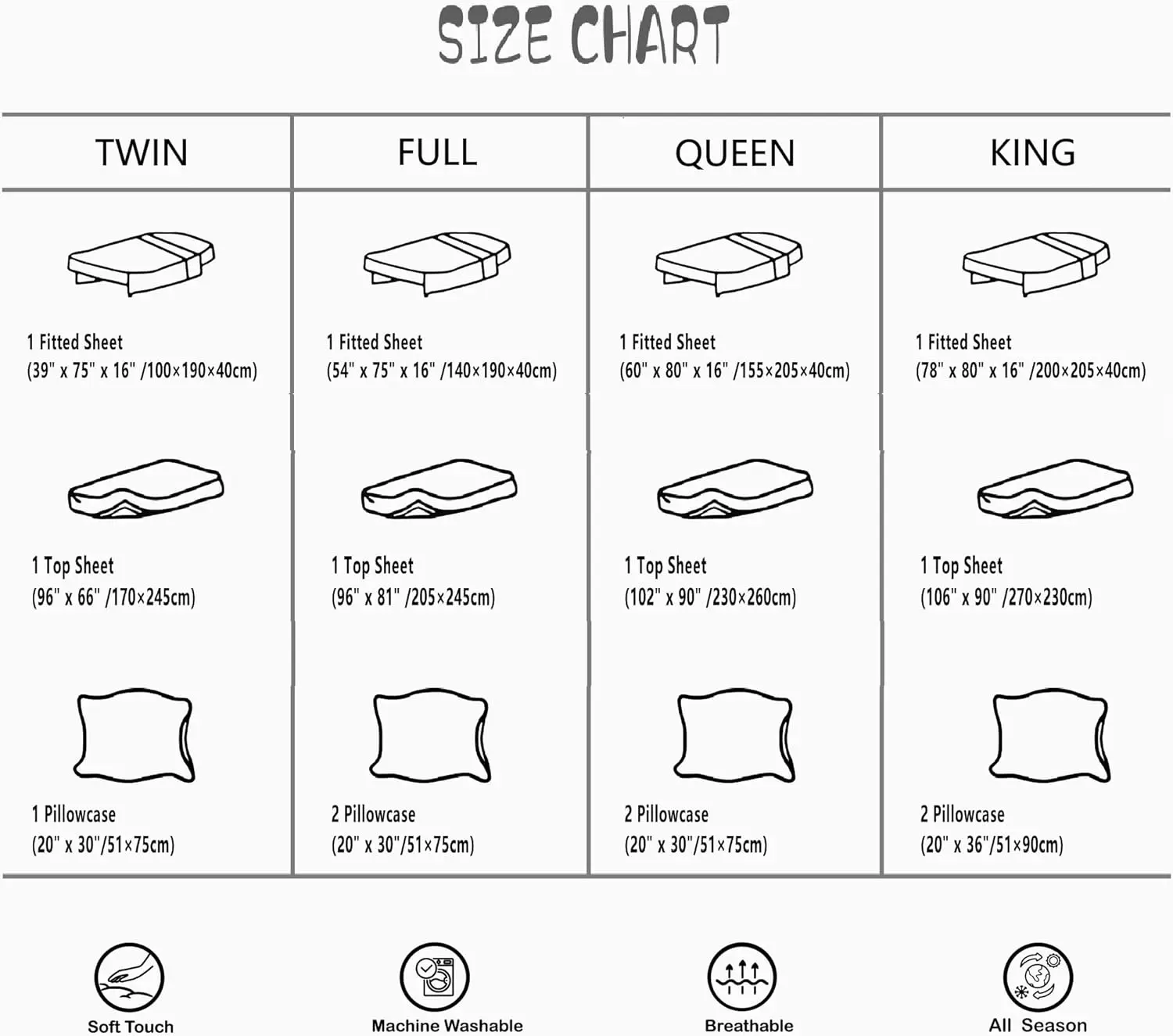 Twin :1x Fitted Sheet 39"x75"x16" and 1x Flat Sheet 96"x66"and 1x Pillowcase 20"x30"