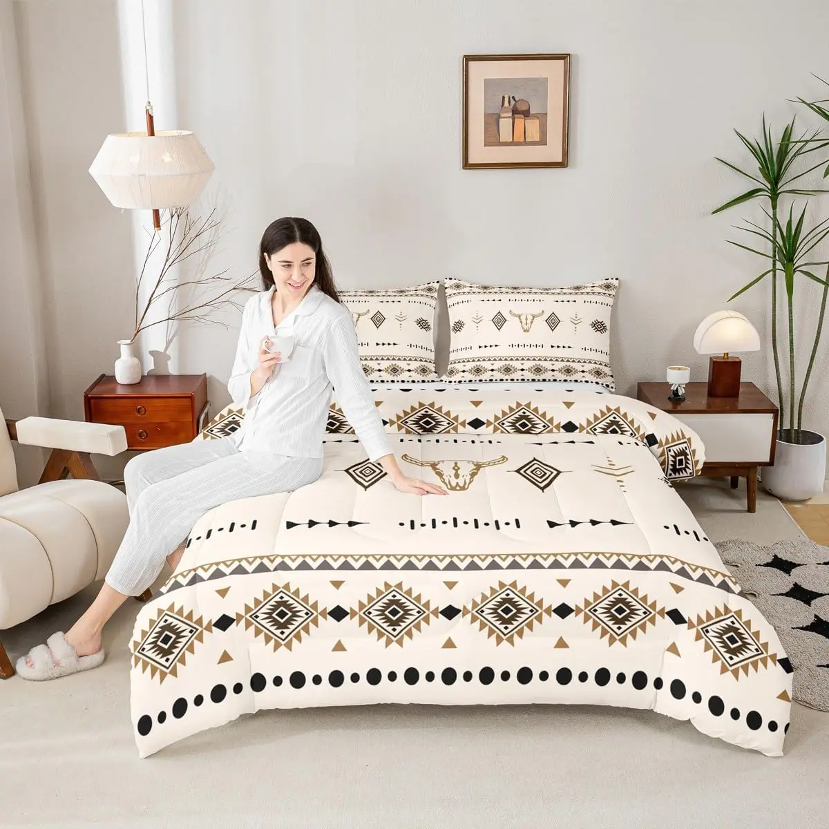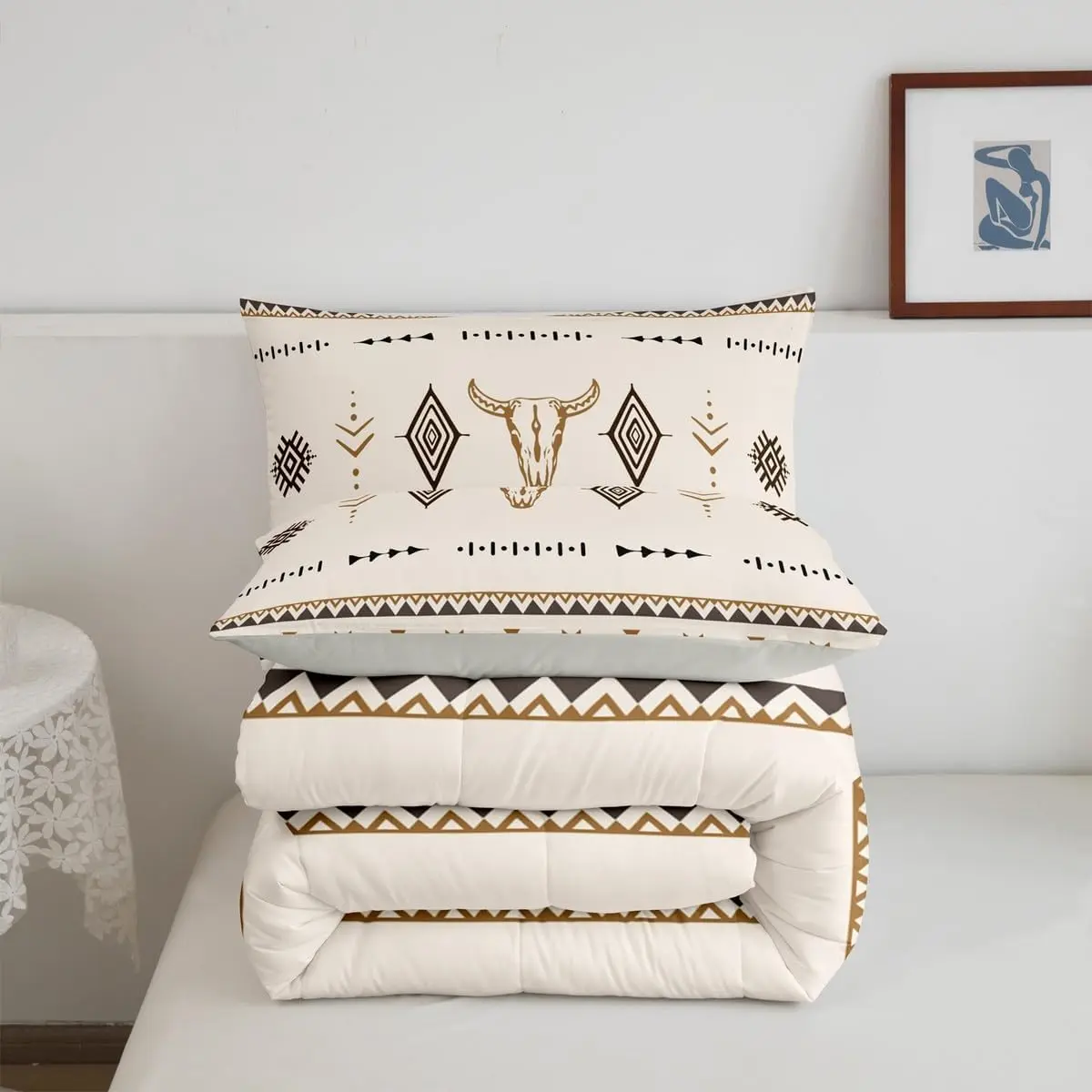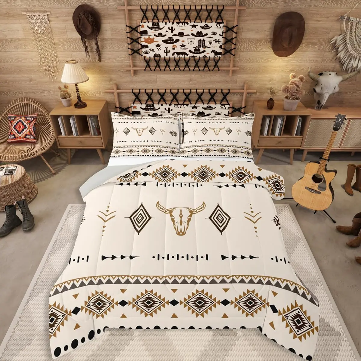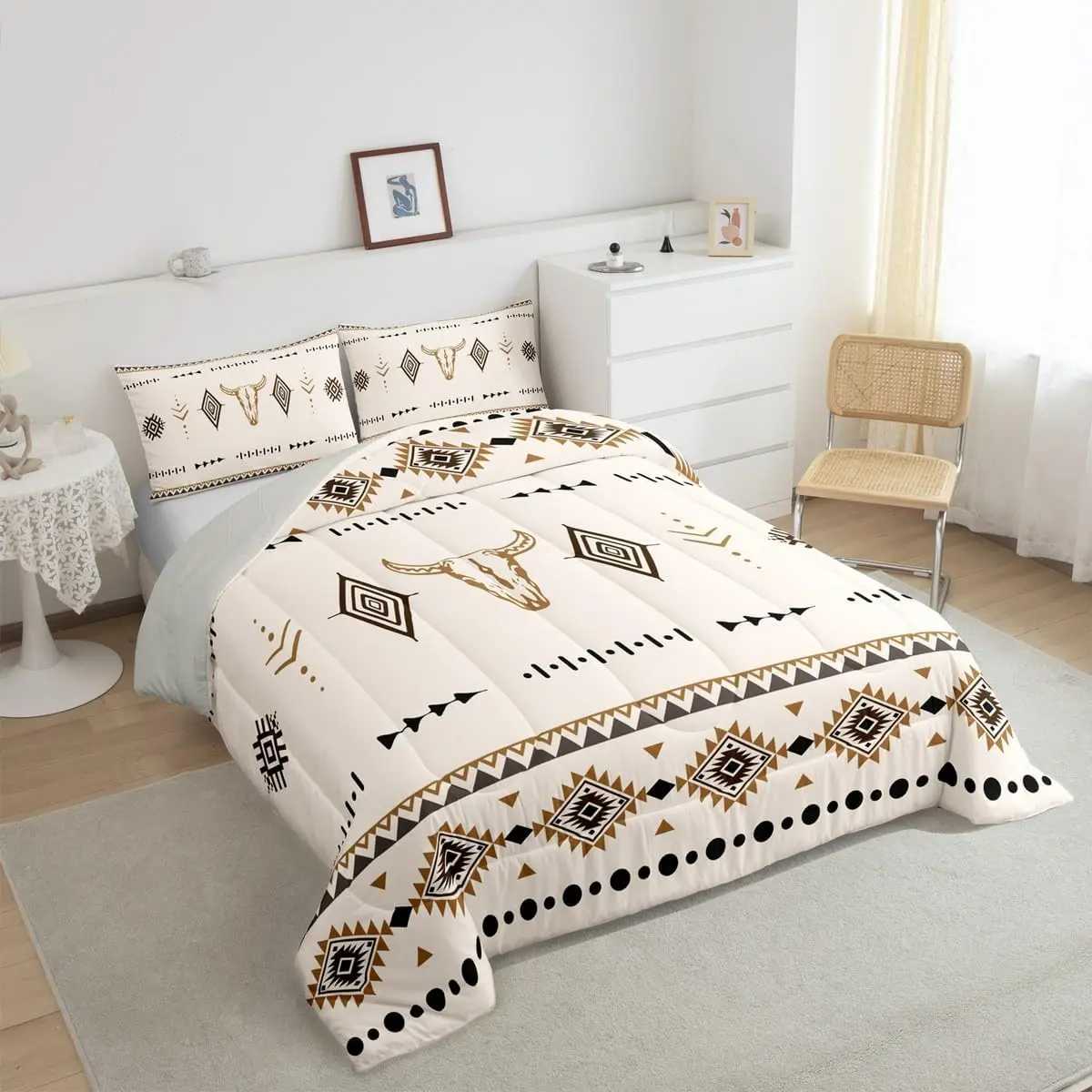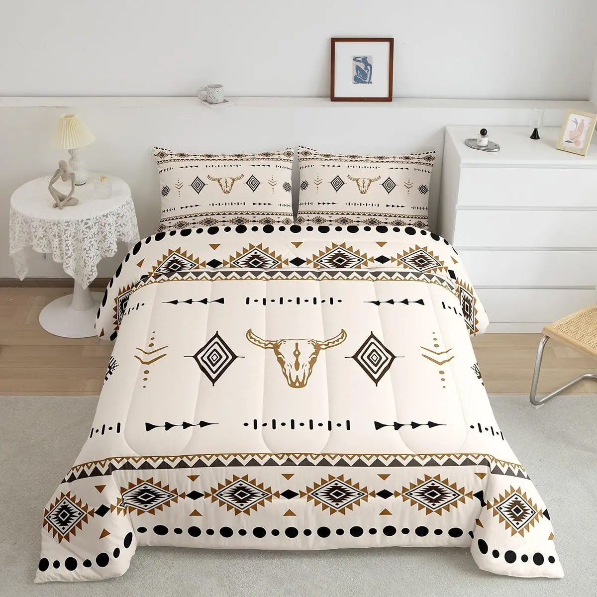 Bull Skull Comforter Set,Western Cowboy Bedding Set for Boys Teens Men,Southwestern Native Quilt,Boho Aztec Ethnic Horns Duvet Insert