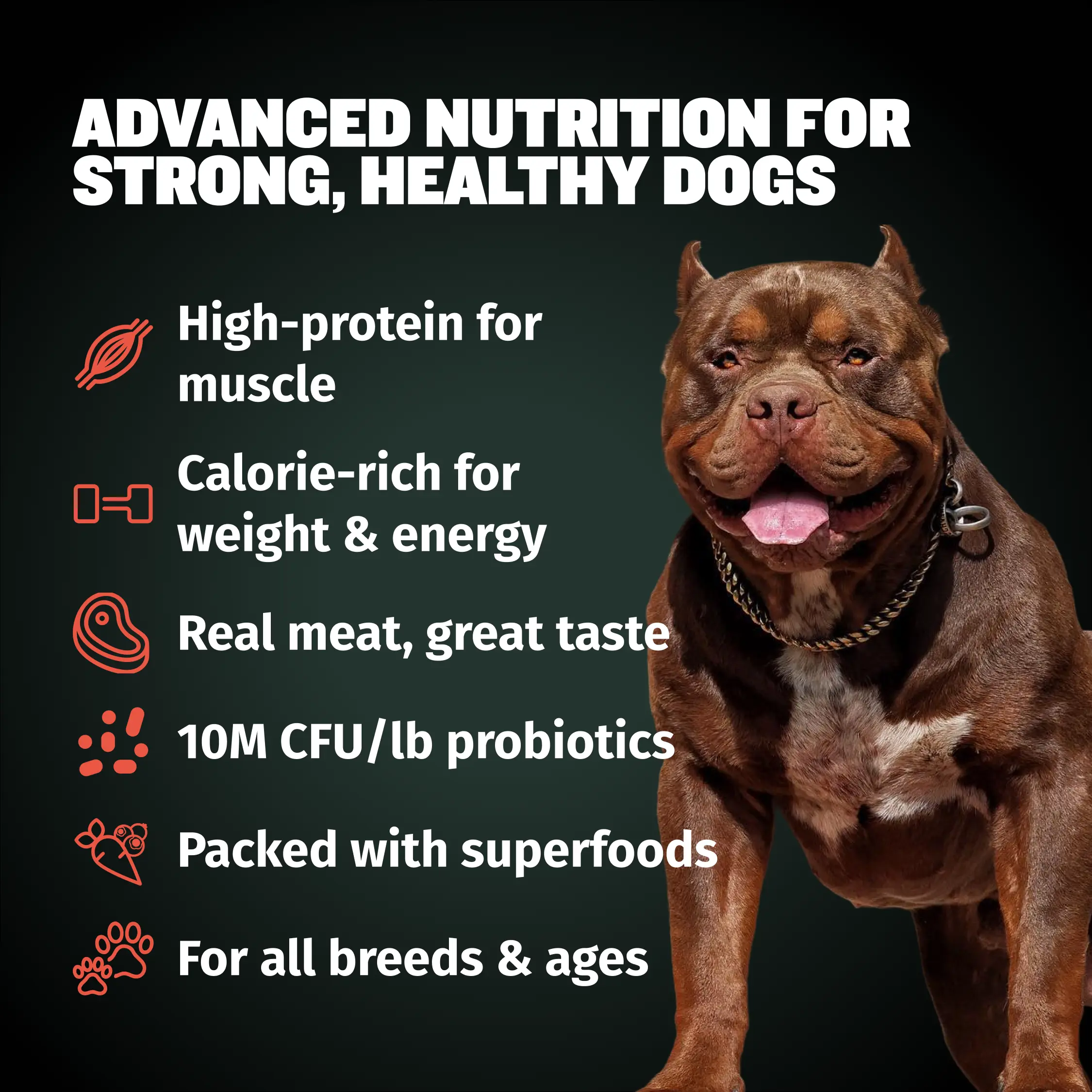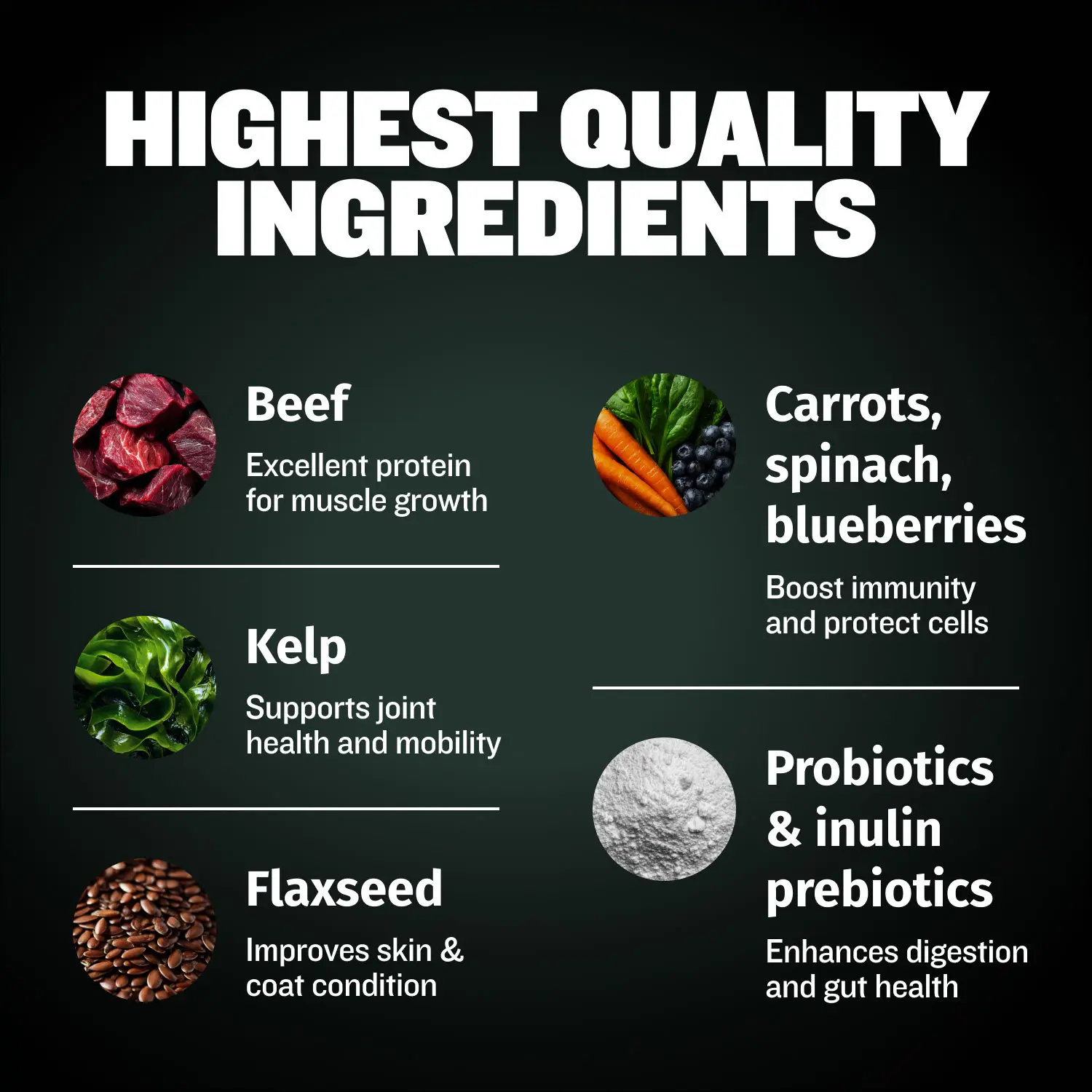 | Ingredients | Beef Meal (Beef meal contains 300% more protein than fresh beef. It’s made by gently cooking beef to remove moisture,creating a rich,concentrated protein source.),Soybean Meal,Beef Tallow,Field Peas,Pea Protein,Sorghum Milo,Dried Beet Pulp,Chickpeas,Flaxseed,Canola Oil (preserved with mixed tocopherols),Brown Rice,Dicalcium Phosphate,Natural Flavor,Salt,Potassium Chloride,Choline Chloride,Inulin,Blueberries,Mixed Tocopherols (a preservative),Taurine,DL Methionine,Carrots,Spinach,L-Lysine,Calcium Carbonate,Vitamin E Supplement,Zinc Sulfate,Zinc Proteinate,Ferrous Sulfate,Iron Proteinate,Niacin Supplement,Kelp,Thiamine Nitrate,Copper Sulfate,Manganese Sulfate,Manganese Proteinate,Copper Proteinate,Pyridoxine Hydrochloride,Riboflavin Supplement,L-Ascorbyl-2-Polyphosphate,d-Calcium Pantothenate,Vitamin B12 Supplement,Vitamin A Acetate,Vitamin D3 Supplement,Citric Acid,Biotin,Folic Acid,Calcium Iodate,Sodium Selenite,Dried Lactobacillus Casei Fermentation Product,Dried Lactobacillus Acidophilus Fermentation Product,Dried Bifidobacterium Animalis Fermentation Product,Dried Lactobacillus Reuteri Fermentation Product. |