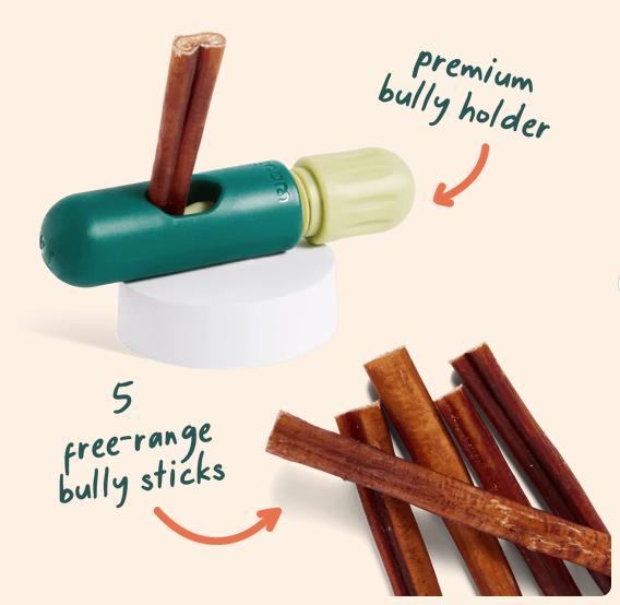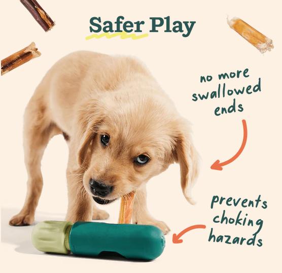 A durable chew holder for safer, longer-lasting play plus 5 free-range, premium Bully Sticks.The BullySafe offers peace of mind by promoting proper chewing, making each Bully Stick last longer for more enjoyment (and serious savings!). It’s crafted from tough, non-toxic nylon to withstand even the most serious chewers, so pups can enjoy their chews without the risk of choking or swallowing big pieces. The easy-to-use, adjustable design is a perfect fit with grass-fed, free-range Woof Bully Sticks.Unscrew it, drop in a Bully Stick or other chew, and screw it closed securely to extend playtime and decrease the risk of choking on loose chews.