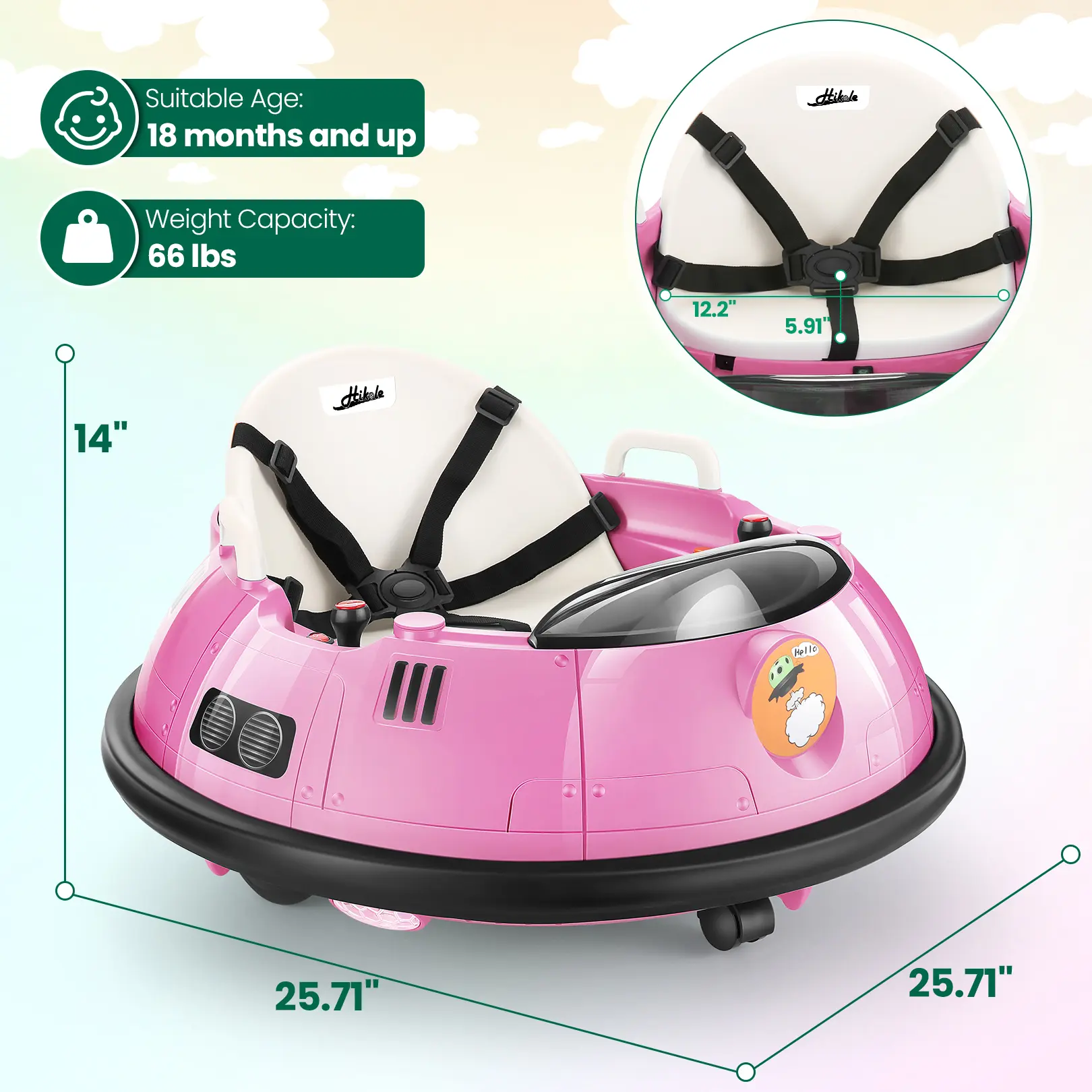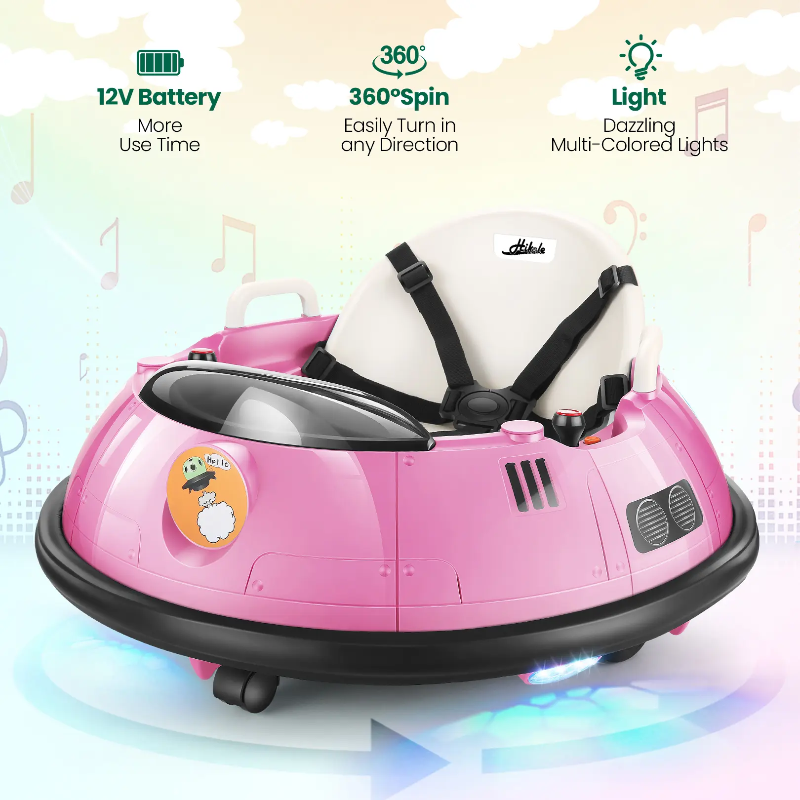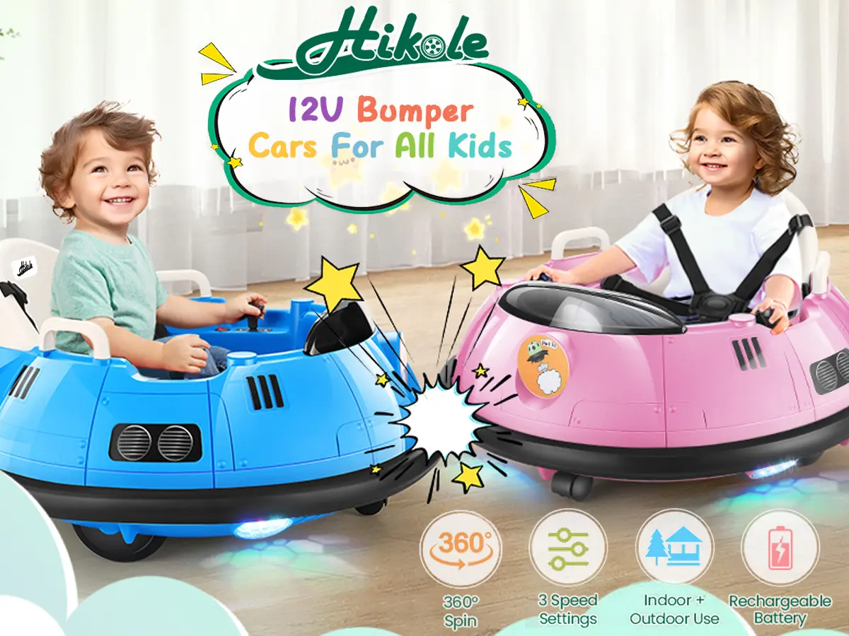Safe and Soft Bumper-Hikole Baby bumper car is equipped with 5-point harness and soft anti-collision strips to protect children from injuries. The ergonomic backrest, seat, adjustable safety belt, and anti-slip footrest ensure a safe and comfortable driving experience.