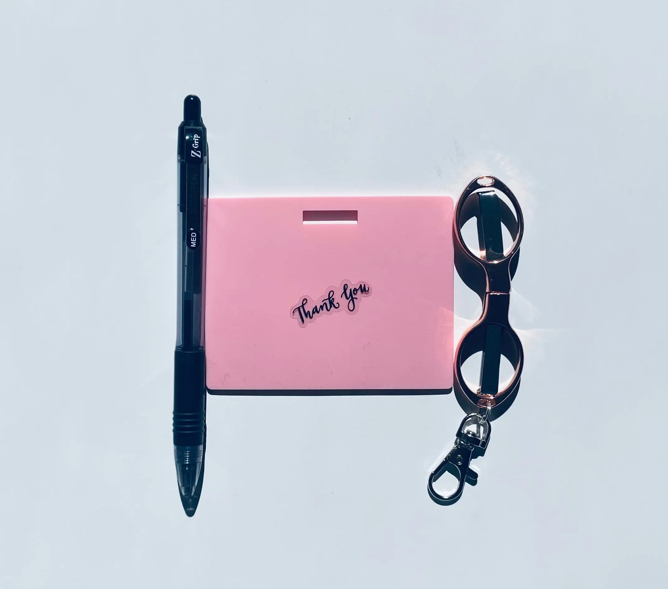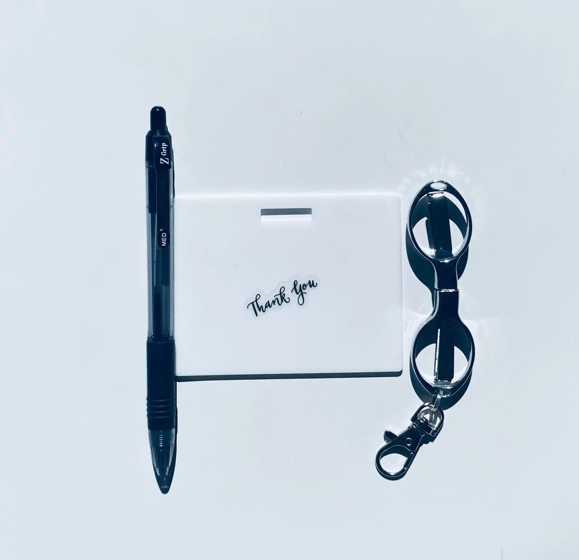 This practical badge note bundle pairs a horizontal design with a reliable Zebra Z-Grip ballpoint pen (black ink) and compact folded scissors—ideal for healthcare professionals, educators, and office environments. The reusable surface accepts standard ballpoint ink and wipes clean with an alcohol pad for repeated use. Note that gel and certain smooth ballpoint formulations may leave residual marks; we recommend testing your preferred pen before regular use to ensure optimal performance and appearance.