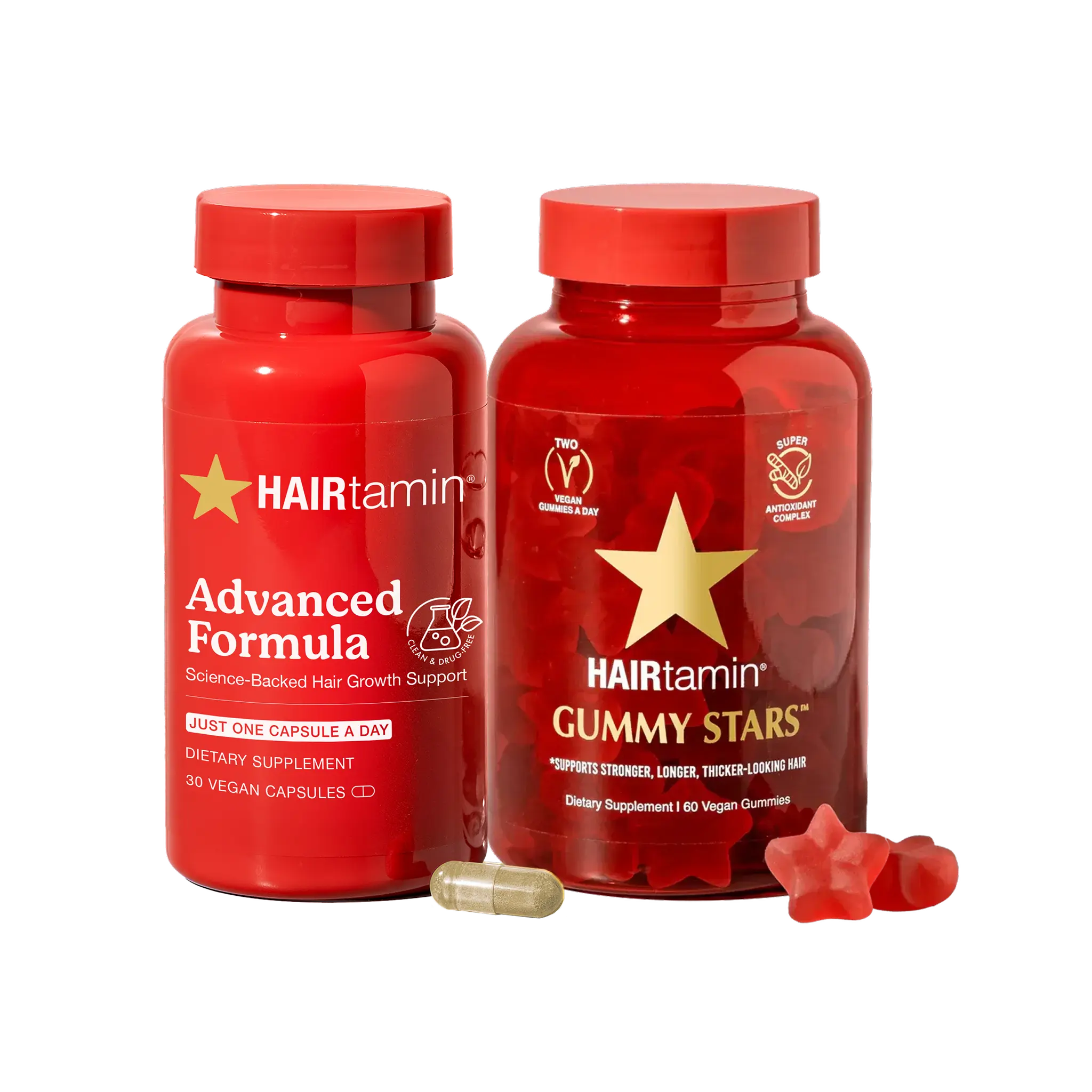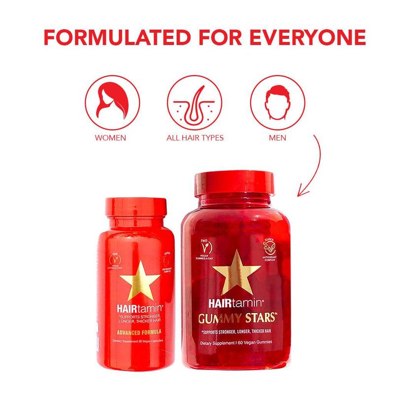 Are you Team Capsules or Team Gummies? Now you don’t have to choose! Our Advanced Yummy Bundle features both of our best-selling hair growth vitamins, HAIRtamin Advanced Formula and Gummy Stars™. Both deliver powerful hair nourishing results giving you the freedom each day to pick how you want to get your healthy hair fix. The perfect his and hers bundle as well for the partner that refuses to take vitamins, but will thank you for the delicious (hair healthy!) treat.