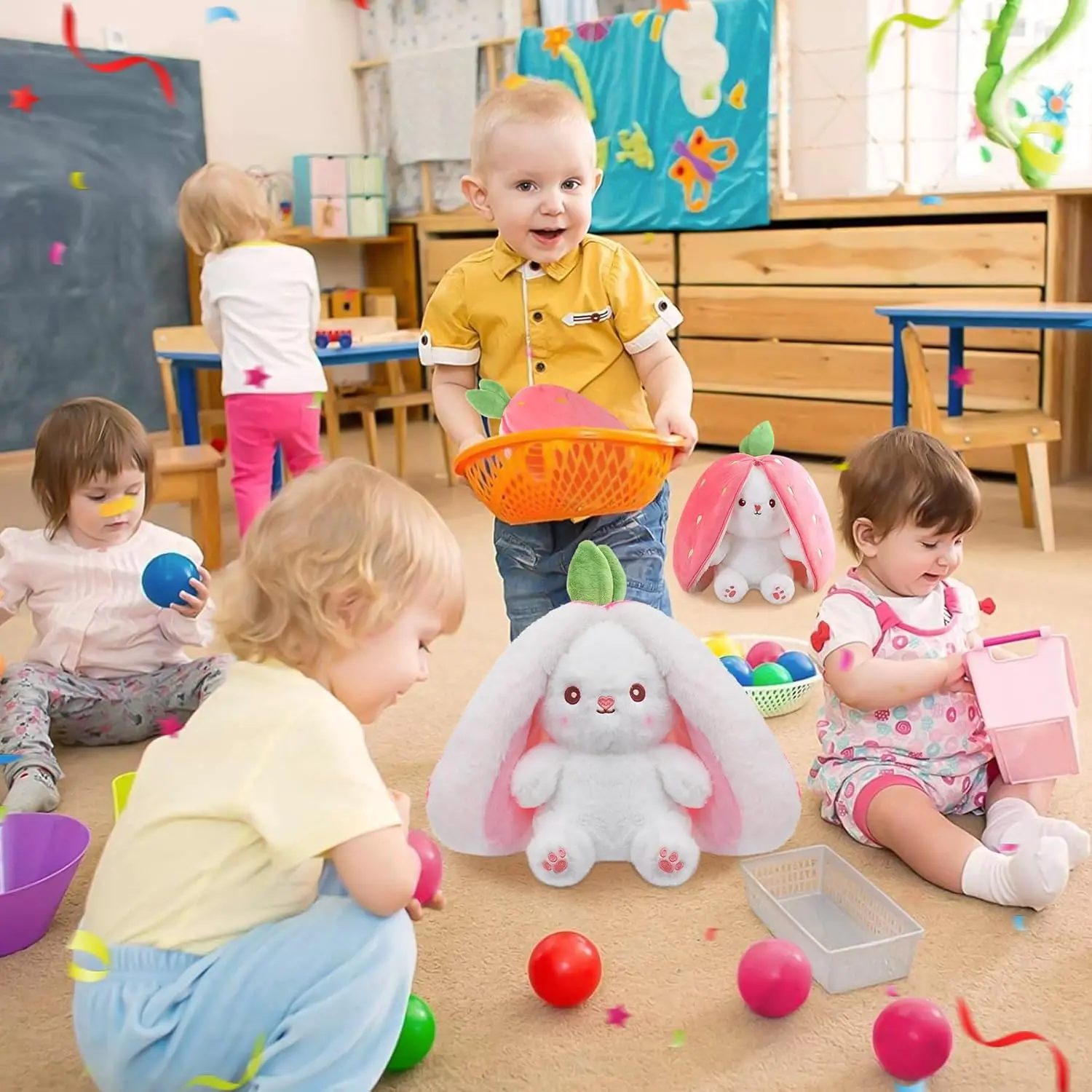 ·【High-Quality Material】Changeable Bunny Plush: It's easy to go from a strawberry to a white rabbit, just by opening the zipper. Bunny stuffed animal, fine workmanship, adorable, soft baby stuffed animal is made with smooth, soft fabrics and filled with recycled squishy stuffing. The size of this stuffed animal fits perfectly for babies easy to take cute stuffed animal anywhere, and will definitely bring a smile to their face.