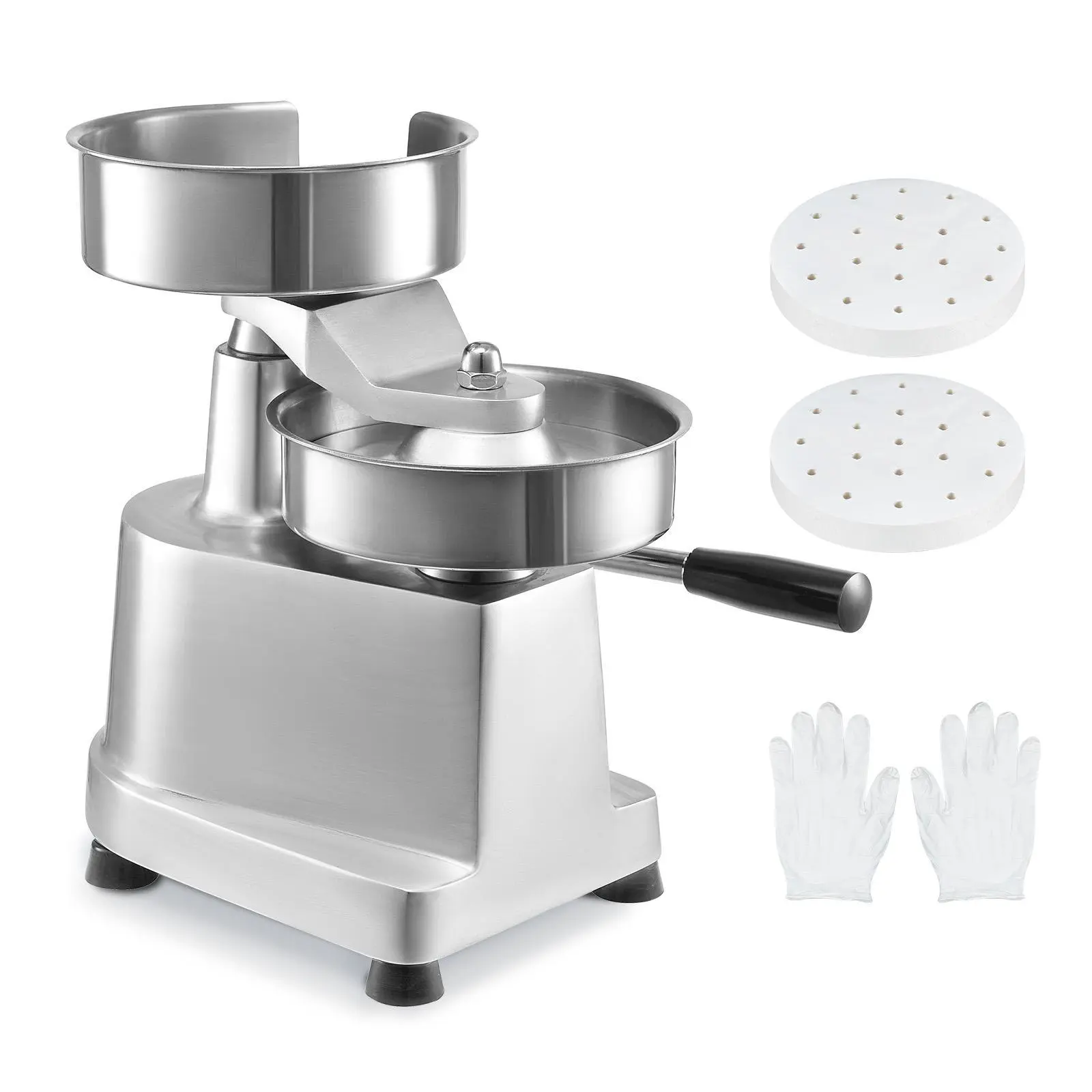 • Thoughtful Design: For your convenience, the hamburger patty press machine is equipped with a paper holder for quick access to burger papers. The side button on the body lowers the press plate, making operation easy and efficient. Additionally, it comes with 2 packs of burger papers totaling 1000 pcs and 2 pairs of gloves.