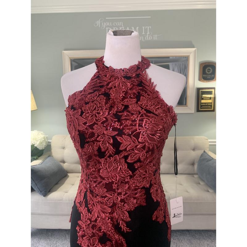 If you are looking to have a themed wedding, this burgundy/black wedding dress will definitely turn heads! It can be worn as a ceremony or a reception dress and has a gorgeous halter neck with burgundy lace all over the bodice and parts of the skirt.