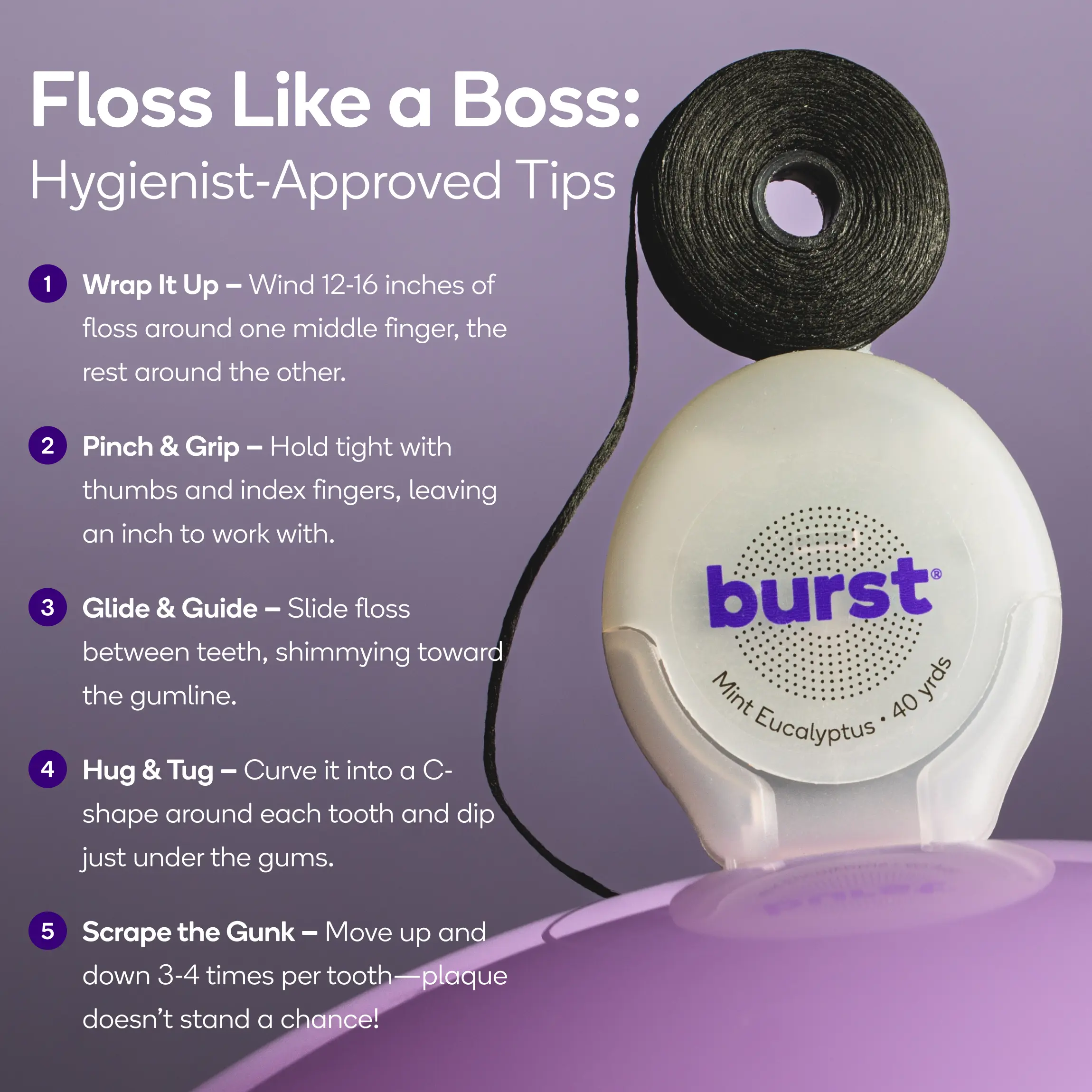 Stain busting: high quality textured thread with adsorptive xylitol coating pulls away stubborn stains that cause cavities.