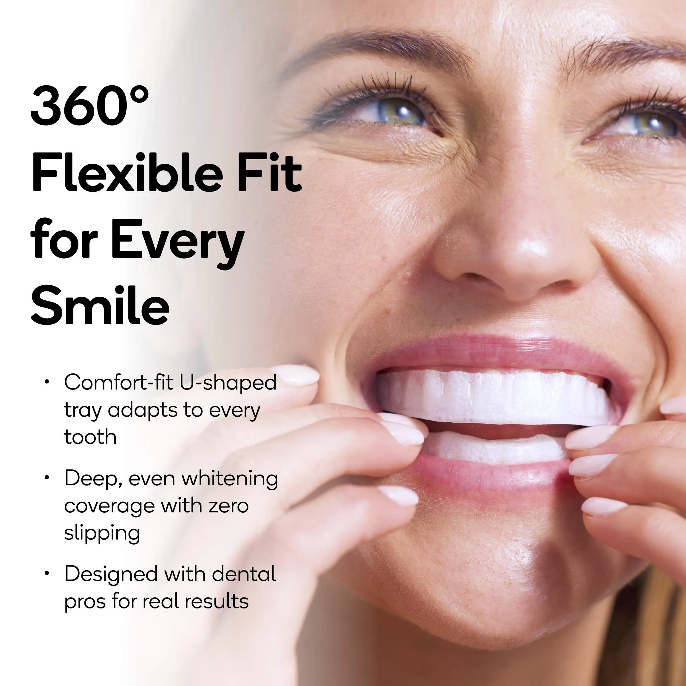 ·Coverage: Innovative flexible U-shaped tray molds to every nook of your unique smile, ensuring even, consistent whitening from every angle.